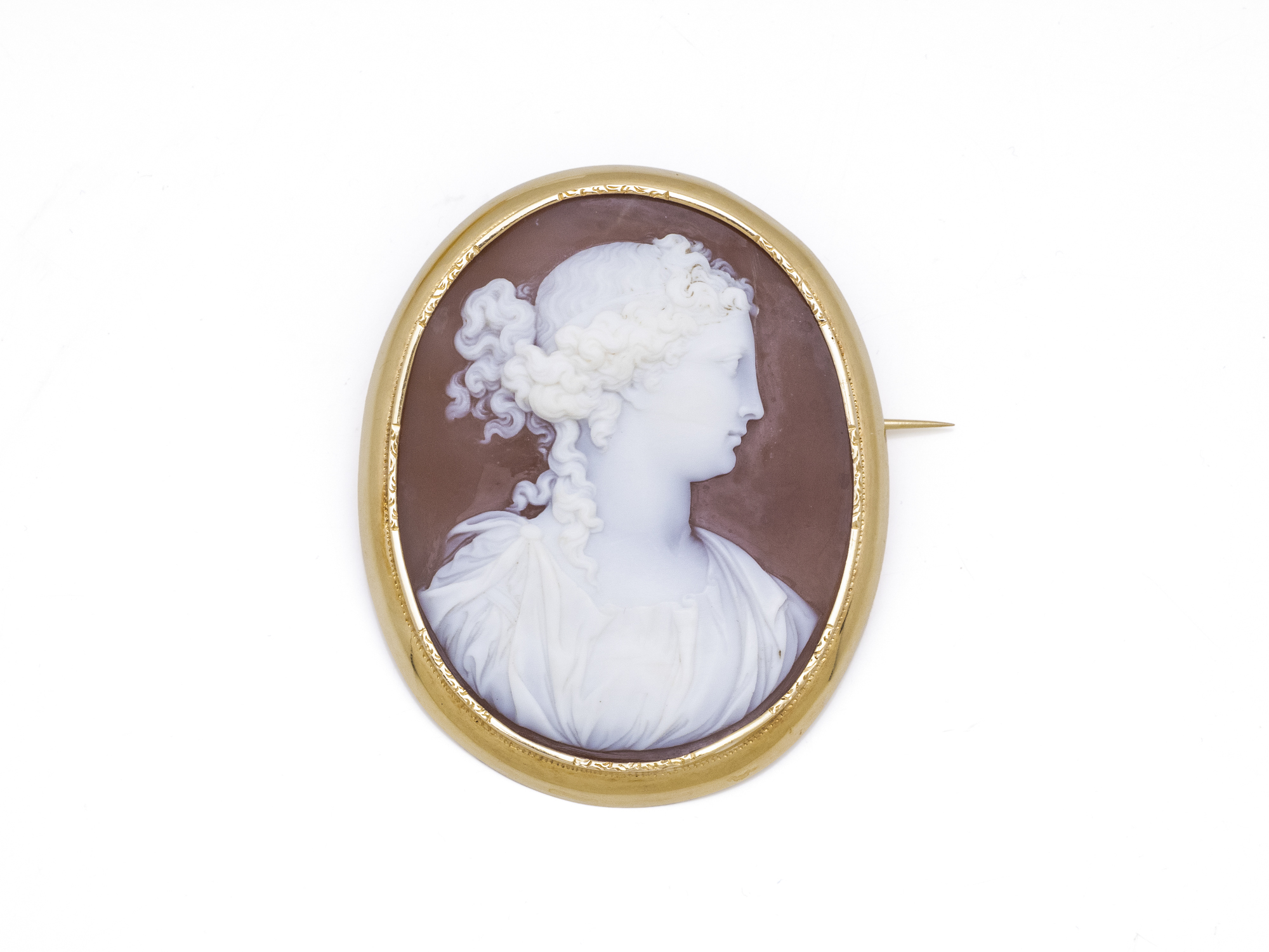 Broche en or 750 millièmes de forme ovale, ornée d'un camée coquille figurant le profil droit d'une femme en buste aux cheveux noués, l'entourage finement ciselé. Travail français de la seconde moitié du XIX° siècle. (très léger fêle, petites usures à la monture)