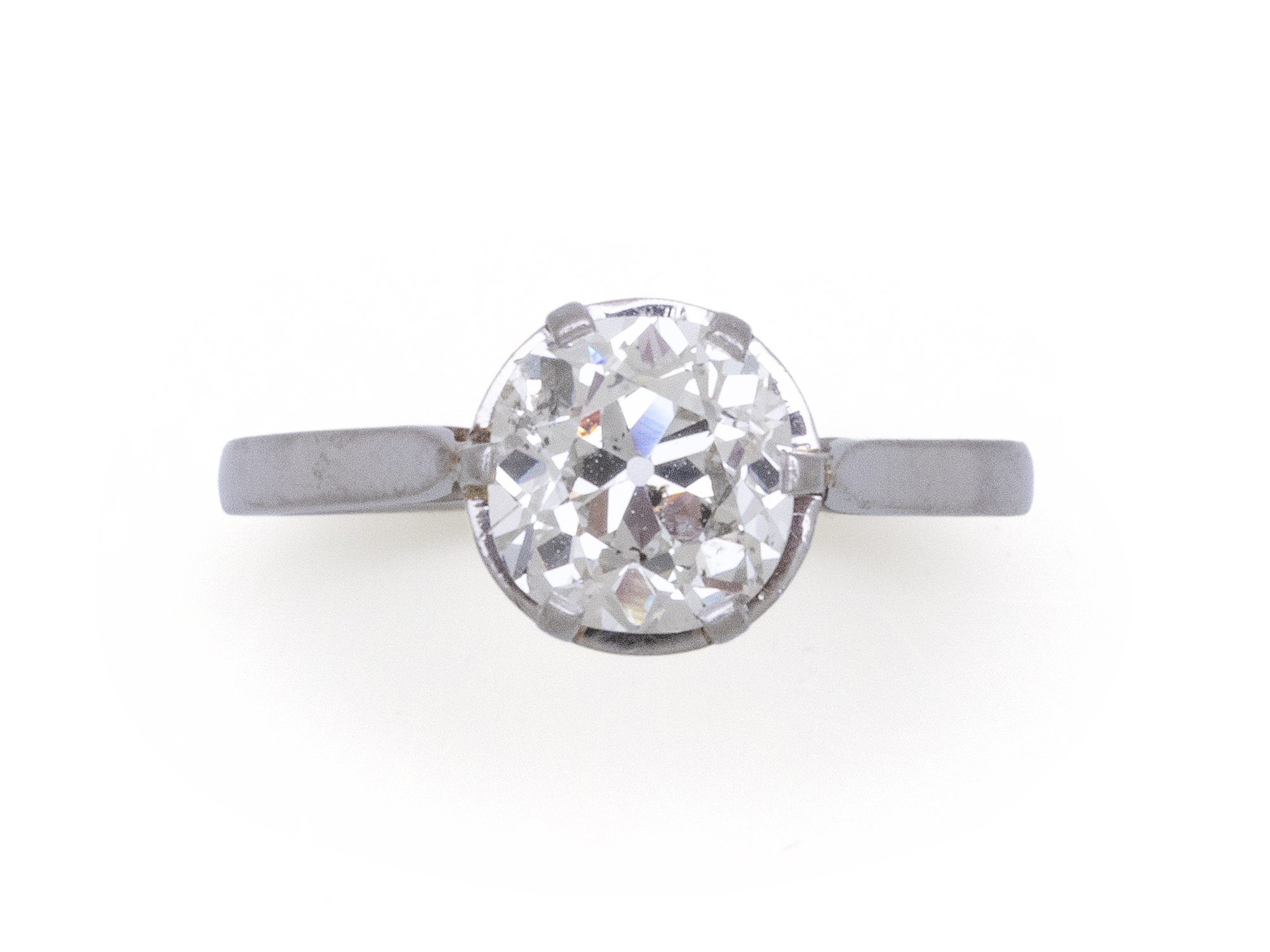Bague solitaire en platine 850 millièmes, ornée d'un diamant coussin de taille ancienne en serti griffe. Vers 1920/30.