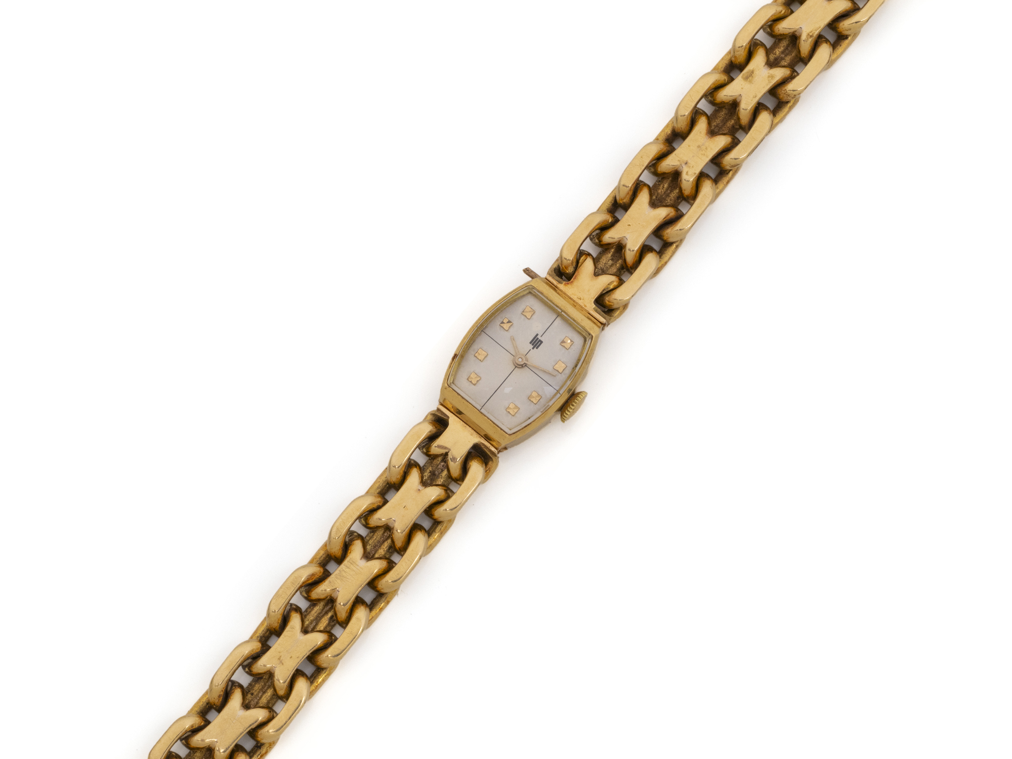 Étonnante assemblage d'un bracelet en or 750 millièmes, maille forçat double stylisée, fermoir invisible à cliquet gravé ''PATEK PHILIPPE & Co'' et d'une montre en or 750 millièmes, de forme tonneau et de marque LIP, enchâssée en son centre. Cadran, et mouvement signés LIP. Mouvement mécanique, calibre T013 avec son cache poussière. Accompagné d'un écrin usagé de la maison PATEK PHILIPPE & Co GENÈVE. Vers 1950. (en l'état pour le mouvement, rayures)