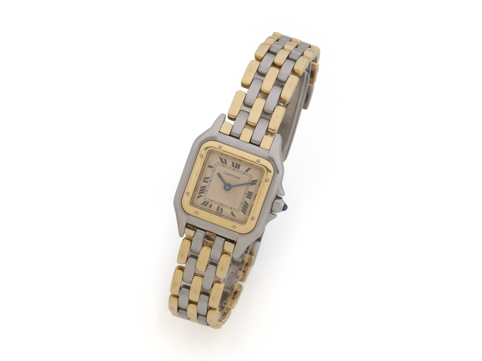 Montre bracelet de dame en or 750 millièmes et acier, cadran ivoire avec chiffres romains peints, lunette en or. Mouvement quartz signé. Bracelet en or 750 millièmes et acier, maillons panthère détendus 2 rangs d'or avec boucle déployante papillon en acier, signée. (rayures)