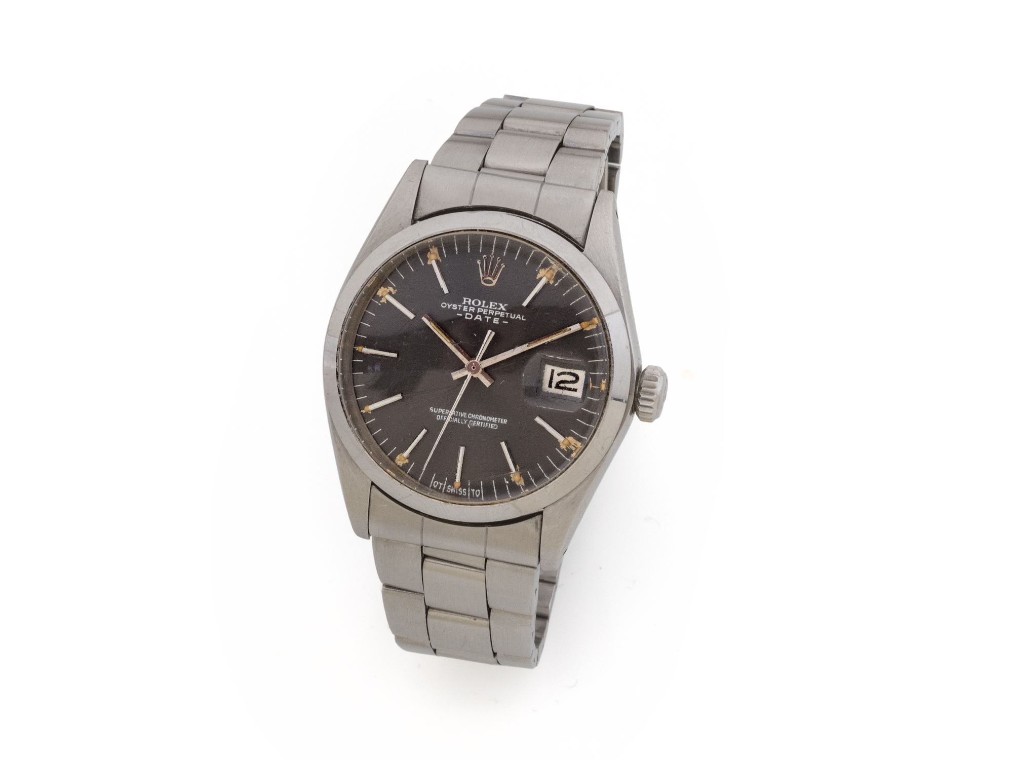 Montre bracelet d'homme en acier, cadran gris rayonnant légèrement taché avec index bâtons appliqués luminescents, affichage de la date par guichet à 3 heures avec loupe. Mouvement automatique signé, numéroté D164720. Bracelet acier, maillons oyster avec boucle déployante réglable en acier, signée. Année 1972. (rayures, verre rayé)