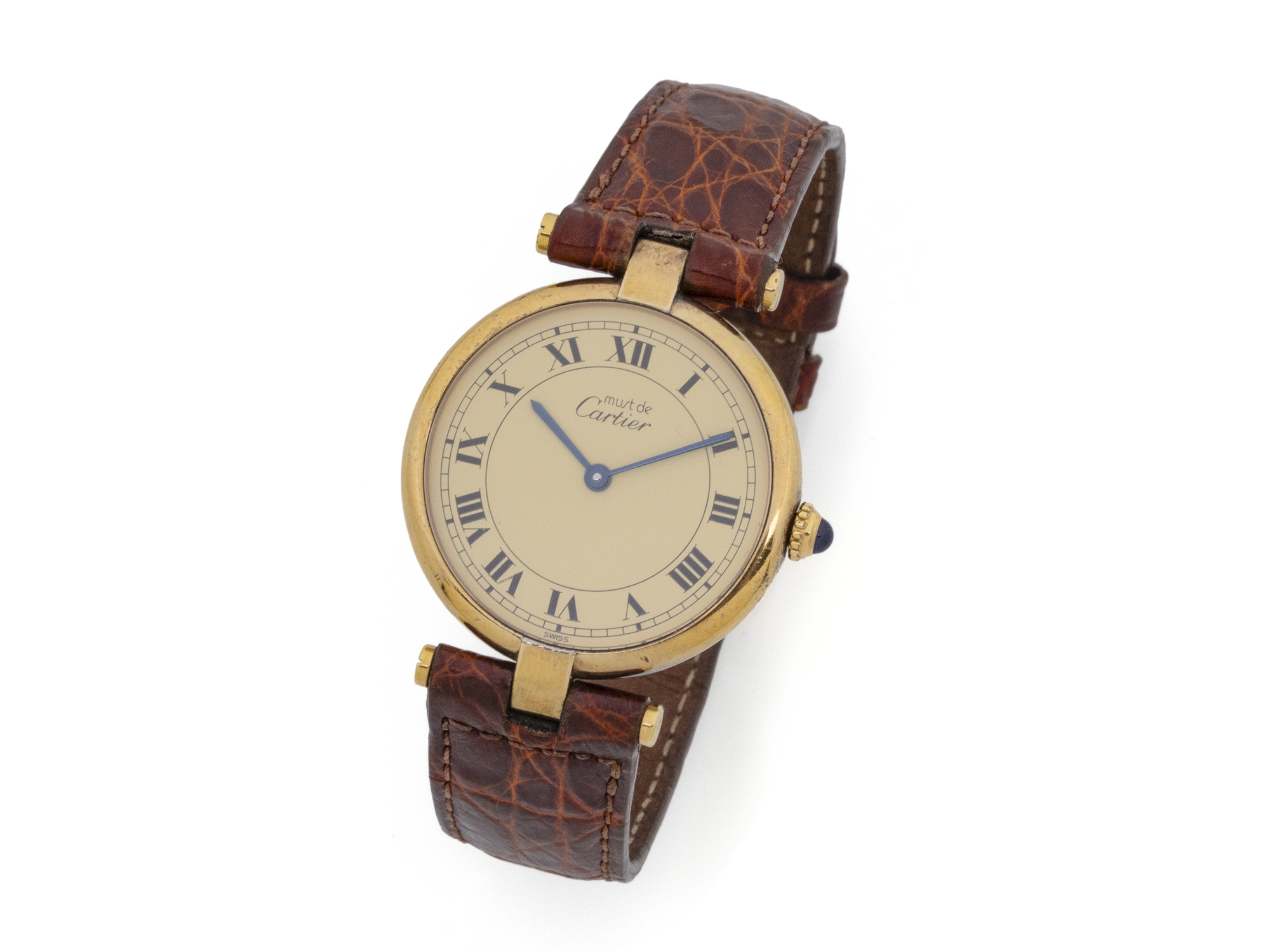 Montre bracelet de dame en vermeil 800 millièmes, boîtier de forme ronde, cadran sable avec chiffres romains peints, chemin de fer pour les minutes. Attaches Vendôme, couronne perlée ponctuée d'un cabochon de pierre bleue. Mouvement quartz signé. Bracelet cuir avec boucle ardillon en métal doré, stylisée. (rayures)