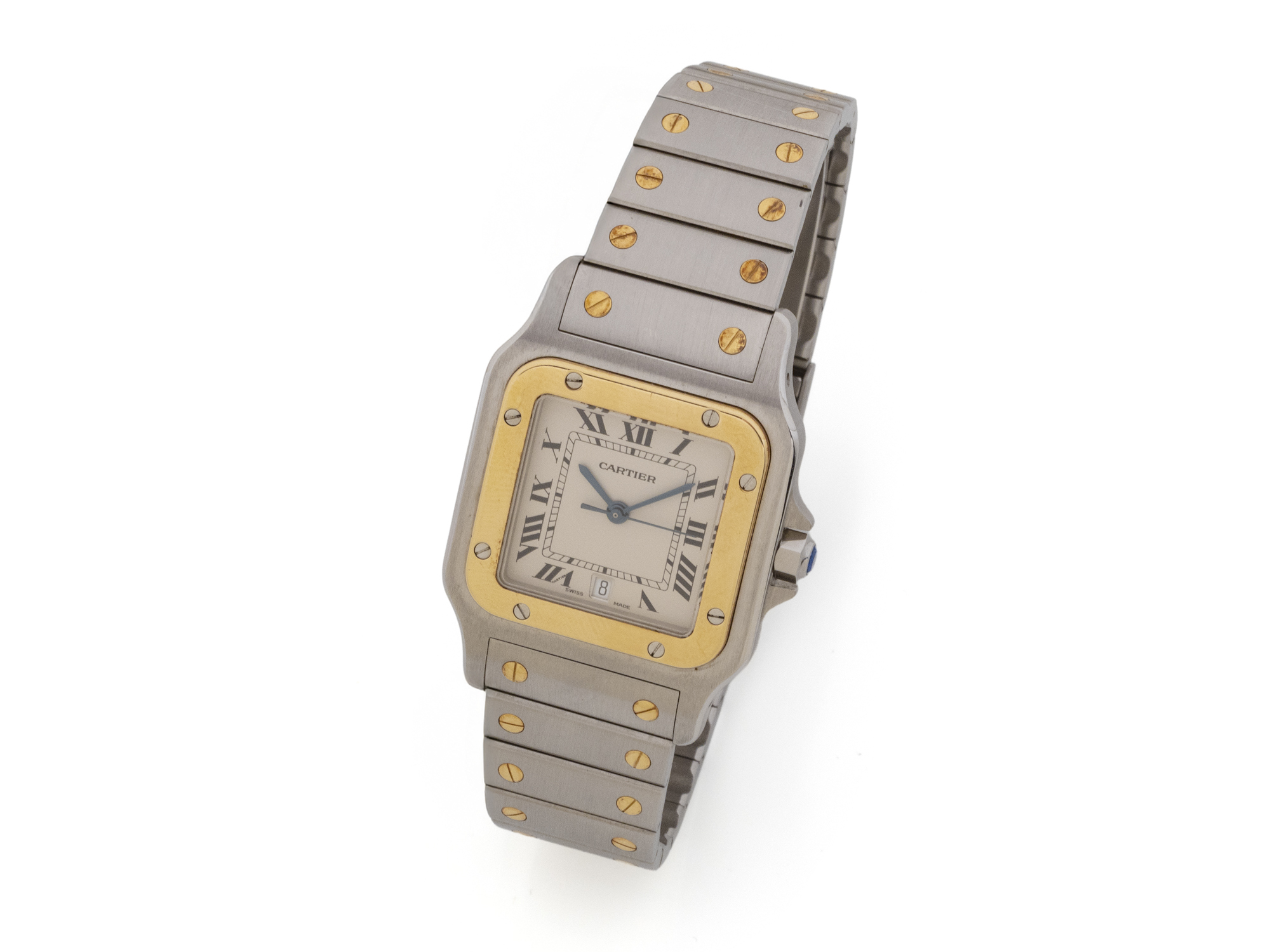 Montre bracelet d'homme en or 750 millièmes et acier brossé, cadran ivoire avec chiffres romains peints, chemin de fer pour les minutes, affichage de la date par guichet à 6 heures, lunette en or à décor de vis. Mouvement quartz. Bracelet en or 750 millièmes et acier brossé, maillons santos avec boucle déployante en acier, signée. Elle est accompagnée de son écrin. (rayures d'usage)