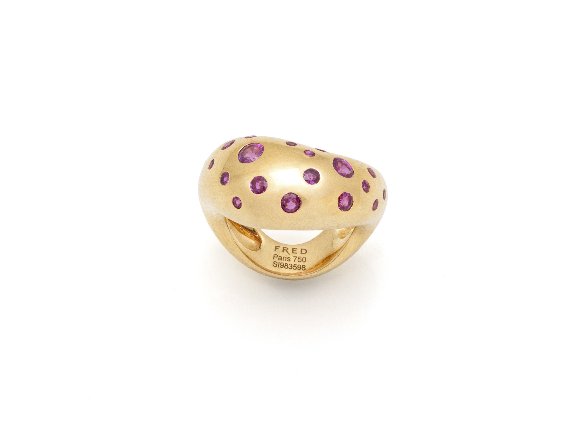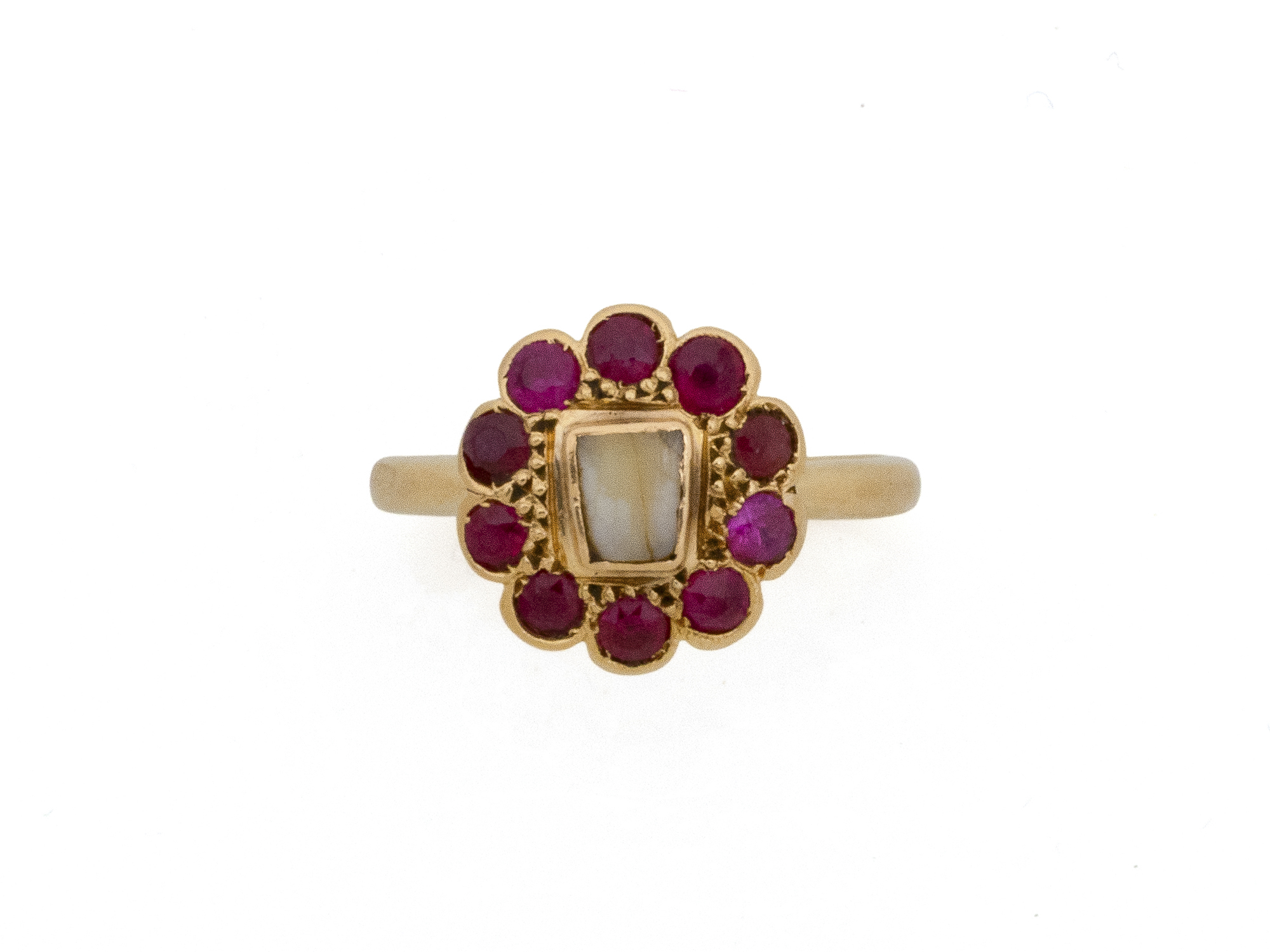 Lot n°70NV1001Bague d'enfant en or 750 millièmes, ornée d'une dent de lait en serti clos dans un entourage festonné rehaussé de pierres rouges. Travail du début du XX° siècle. (égrisures)