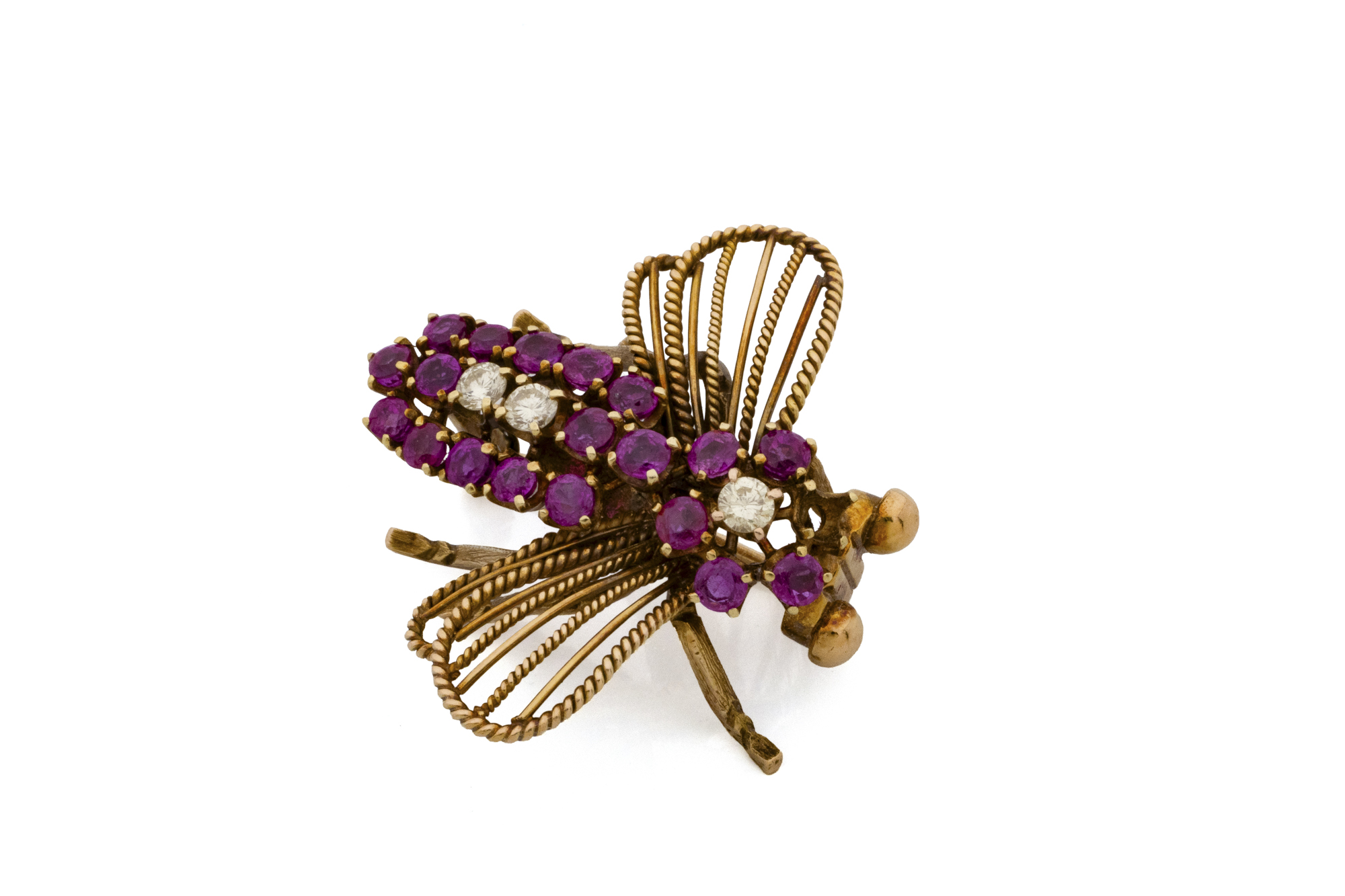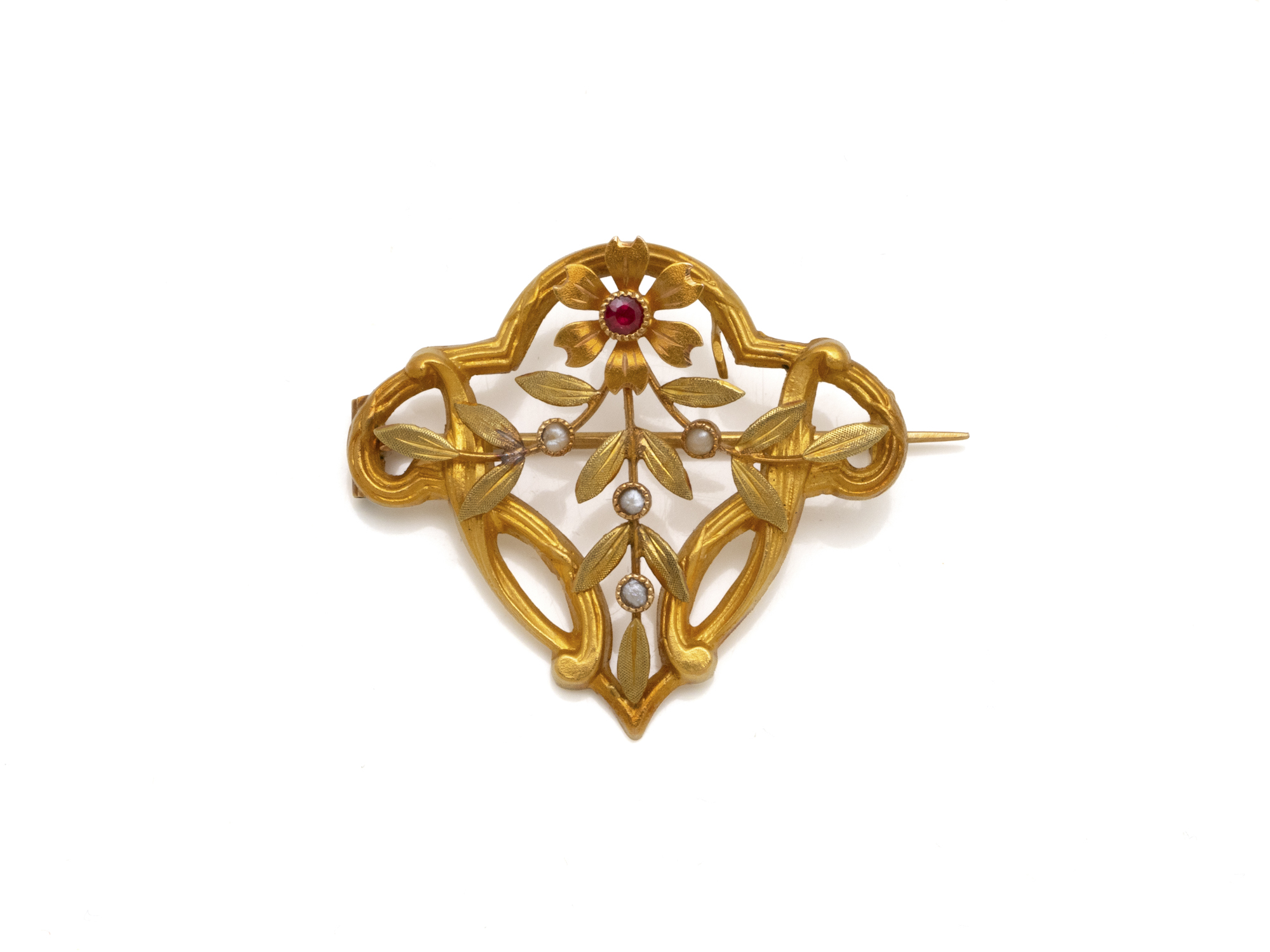 Lot n°71NV1058Broche pendentif en or 750 millièmes à décor floral, ponctuée d'une pierre rouge et de demi-perles en serti clos. Travail français vers 1900.
