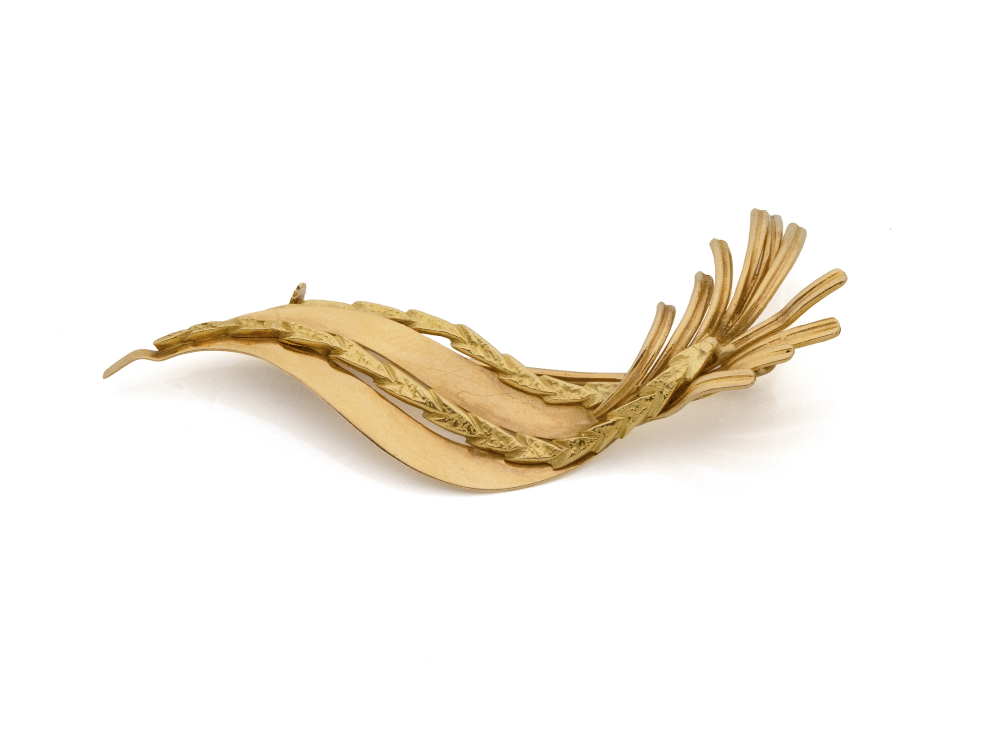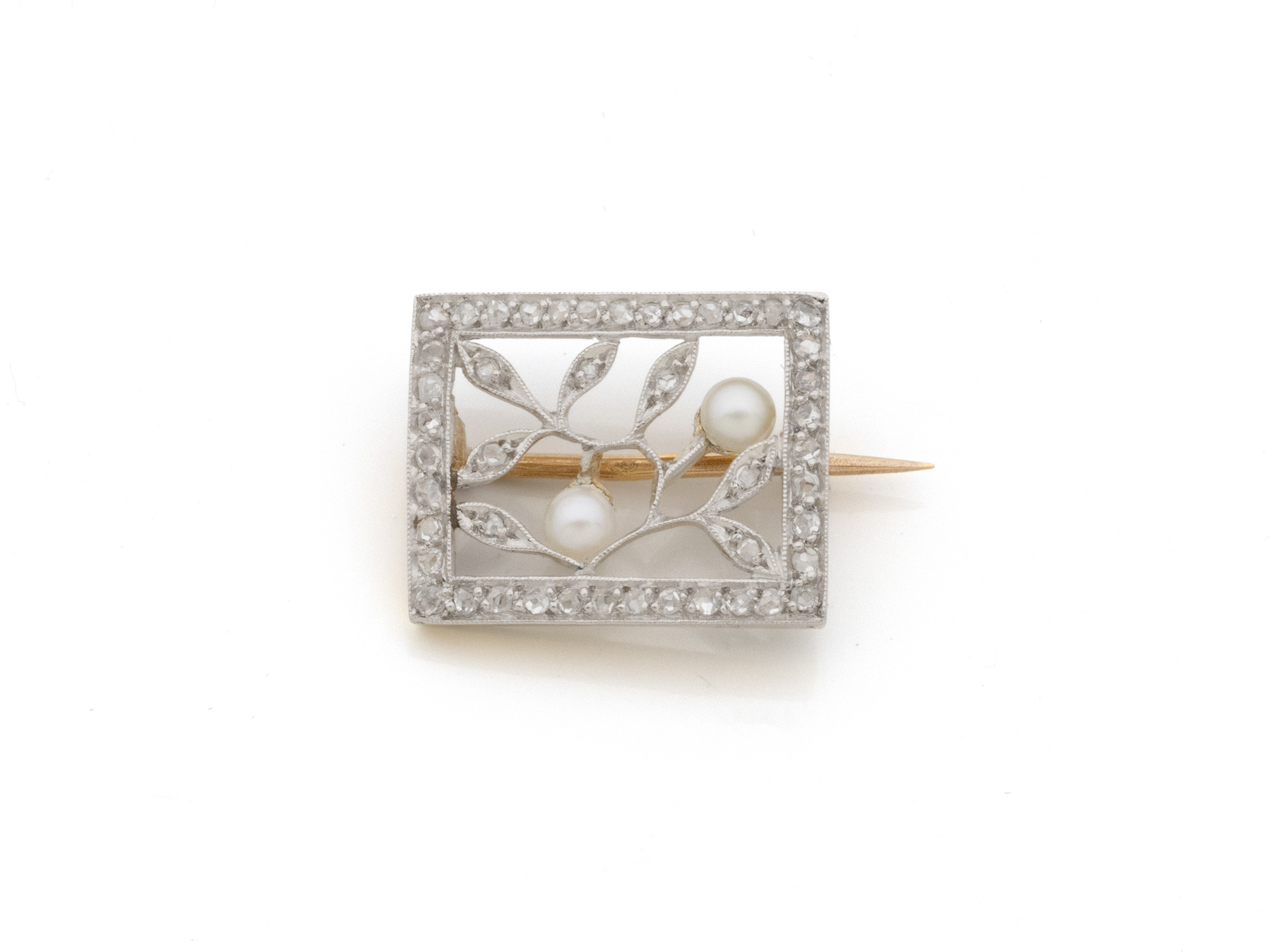 Lot n°63NV1200Petite broche en or 750 millièmes estampé, de forme ronde, à décor feuillagé finement ciselé et ponctué de petite perles fines dans un entourage à filets enrubannés. Travail français vers 1900.