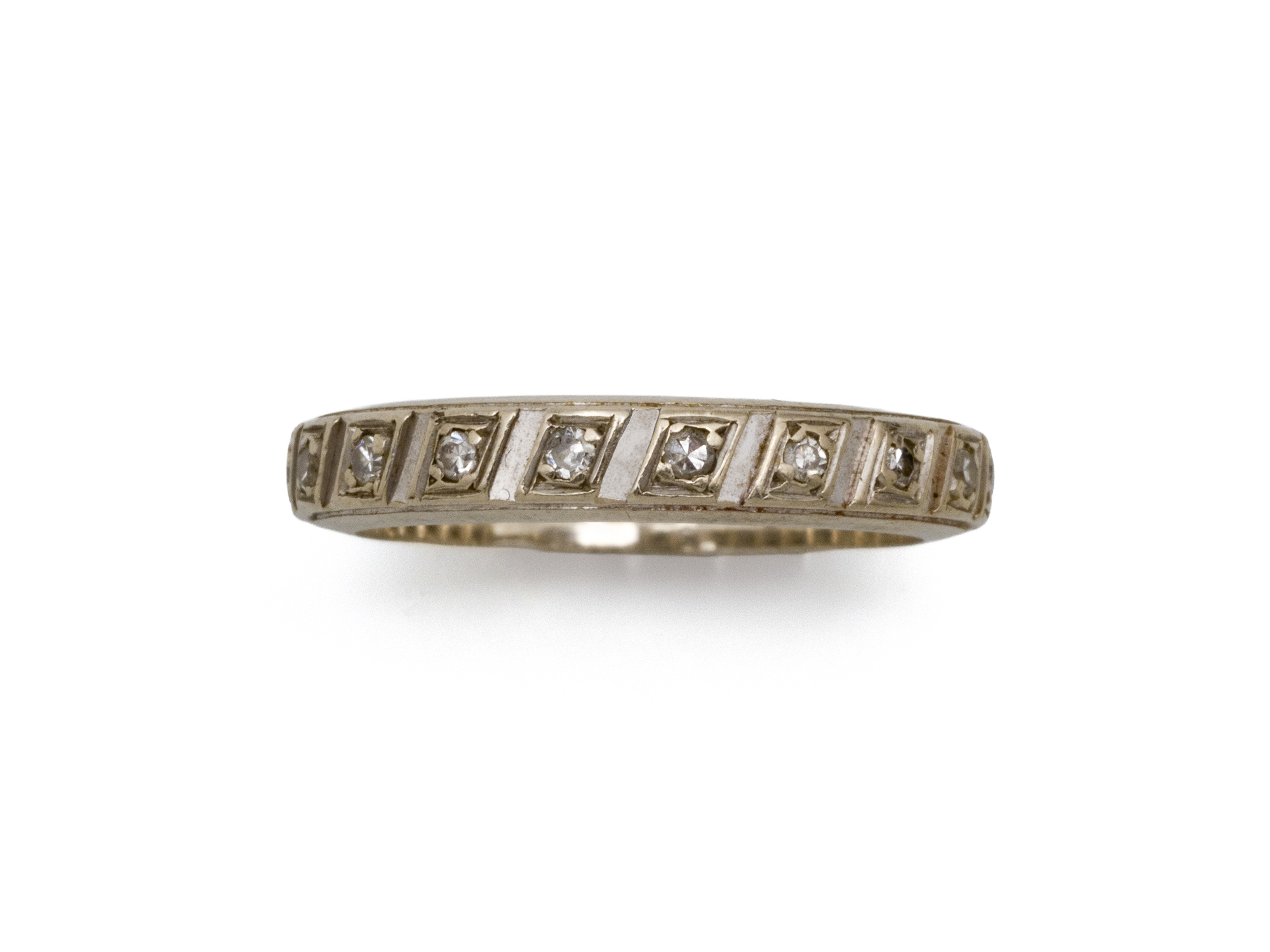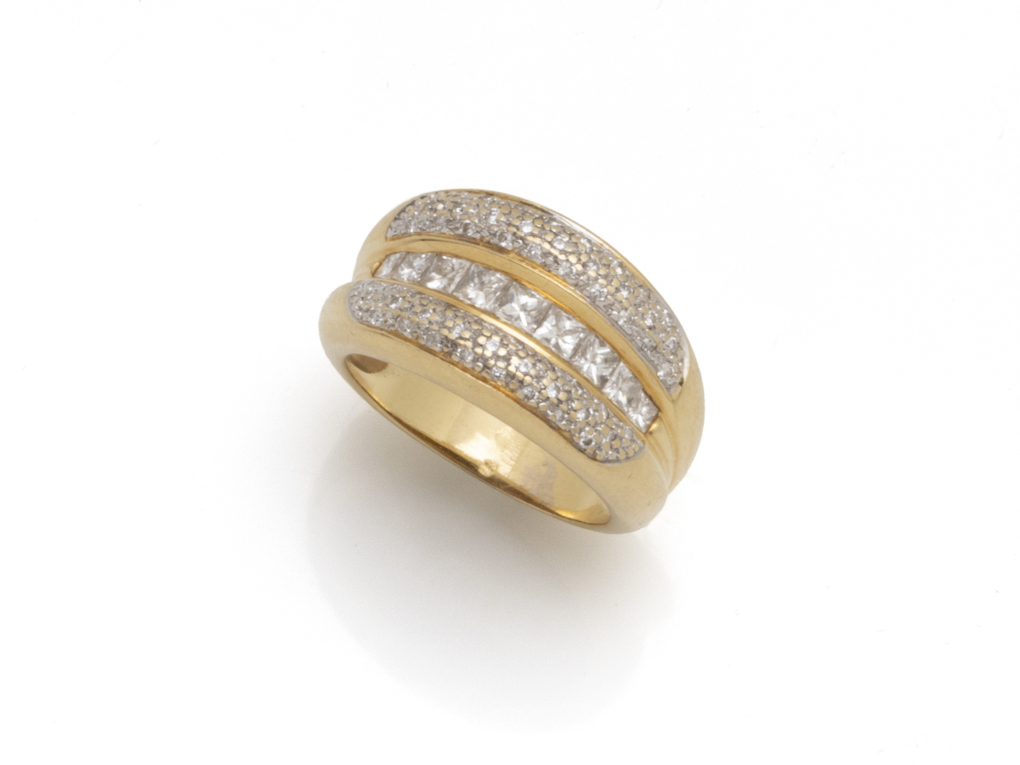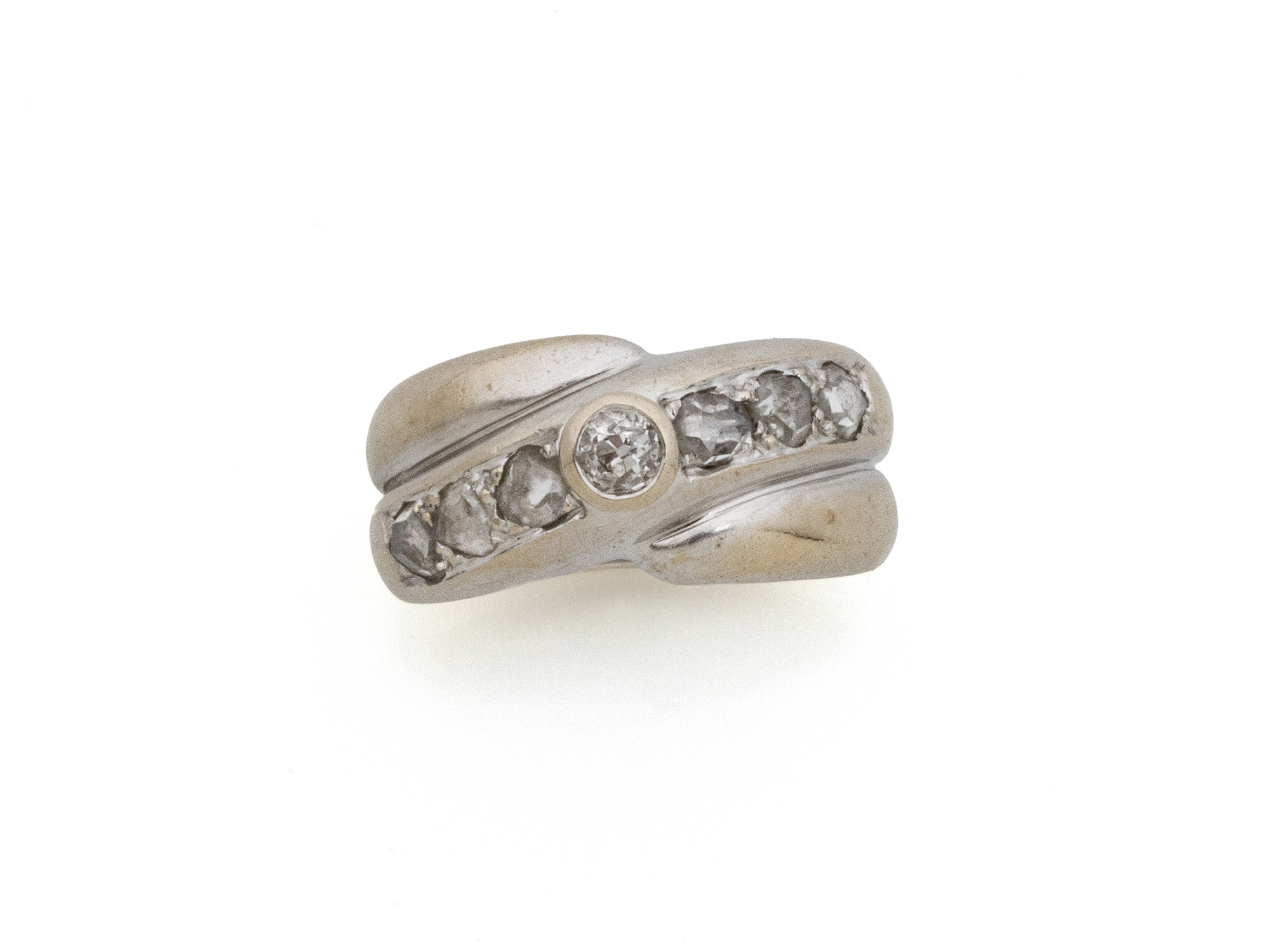Lot n°69NV1064Bague en or 750 et platine 850 millièmes, ornée de 2 chutes de diamants taille ancienne en serti griffe dans un décor croisé. Vers 1900. (trace de mise à taille)