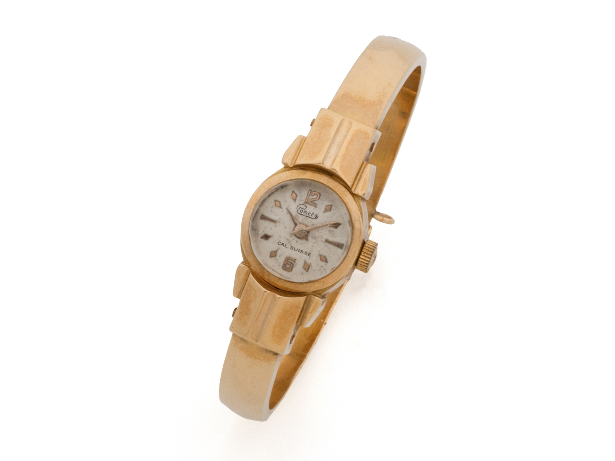 Lot n°222NV1012Montre bracelet de dame en or 750 millièmes, cadran ivoire taché avec chiffres arabes et index en relief. Attaches stylisées. Mouvement mécanique. Bracelet jonc rigide ouvrant en or 750 millièmes avec chaînette de sécurité. Travail français pour la montre, suisse pour le mouvement, vers 1940/50. (petits chocs, verre craquelé, rayures)