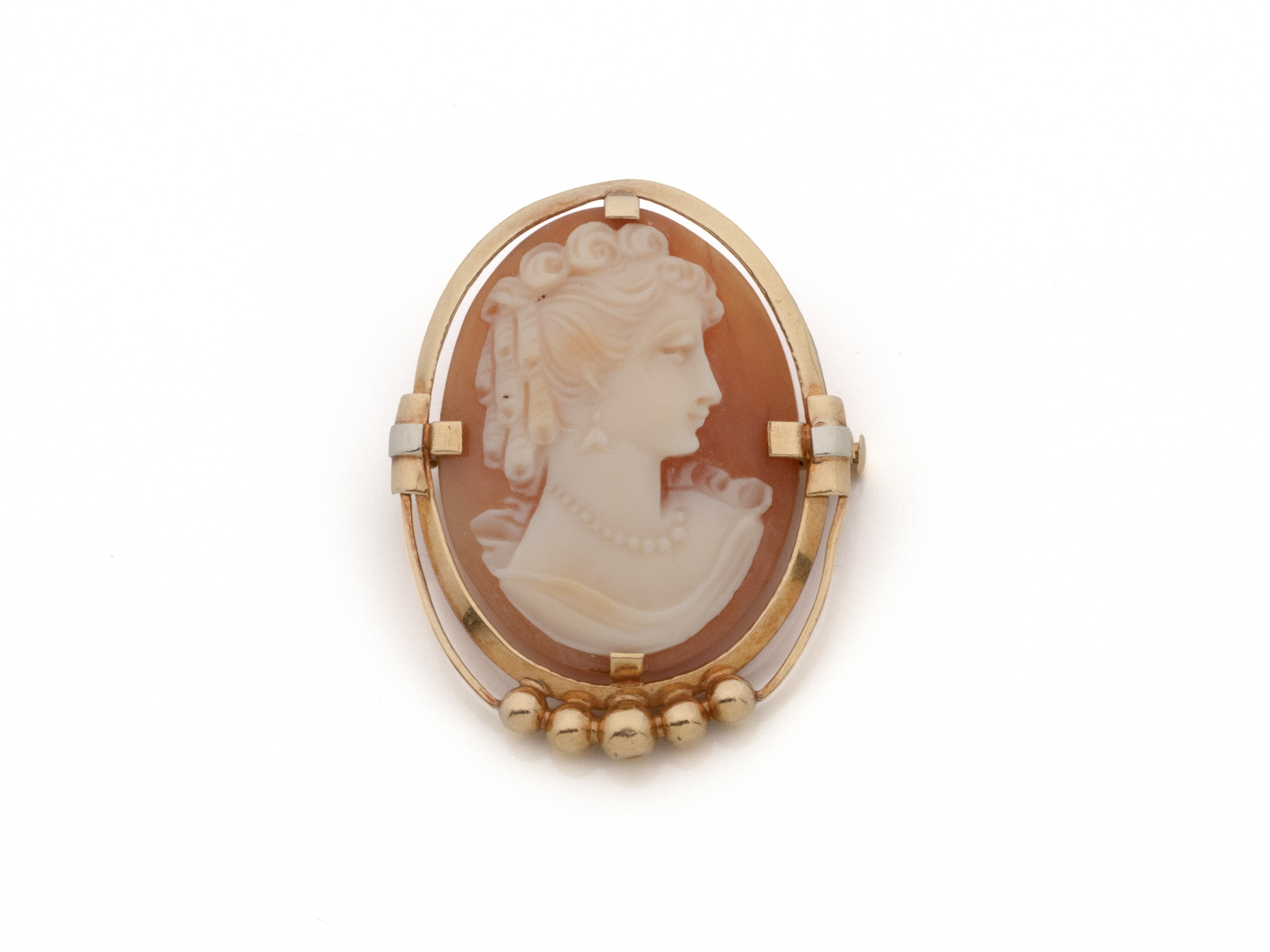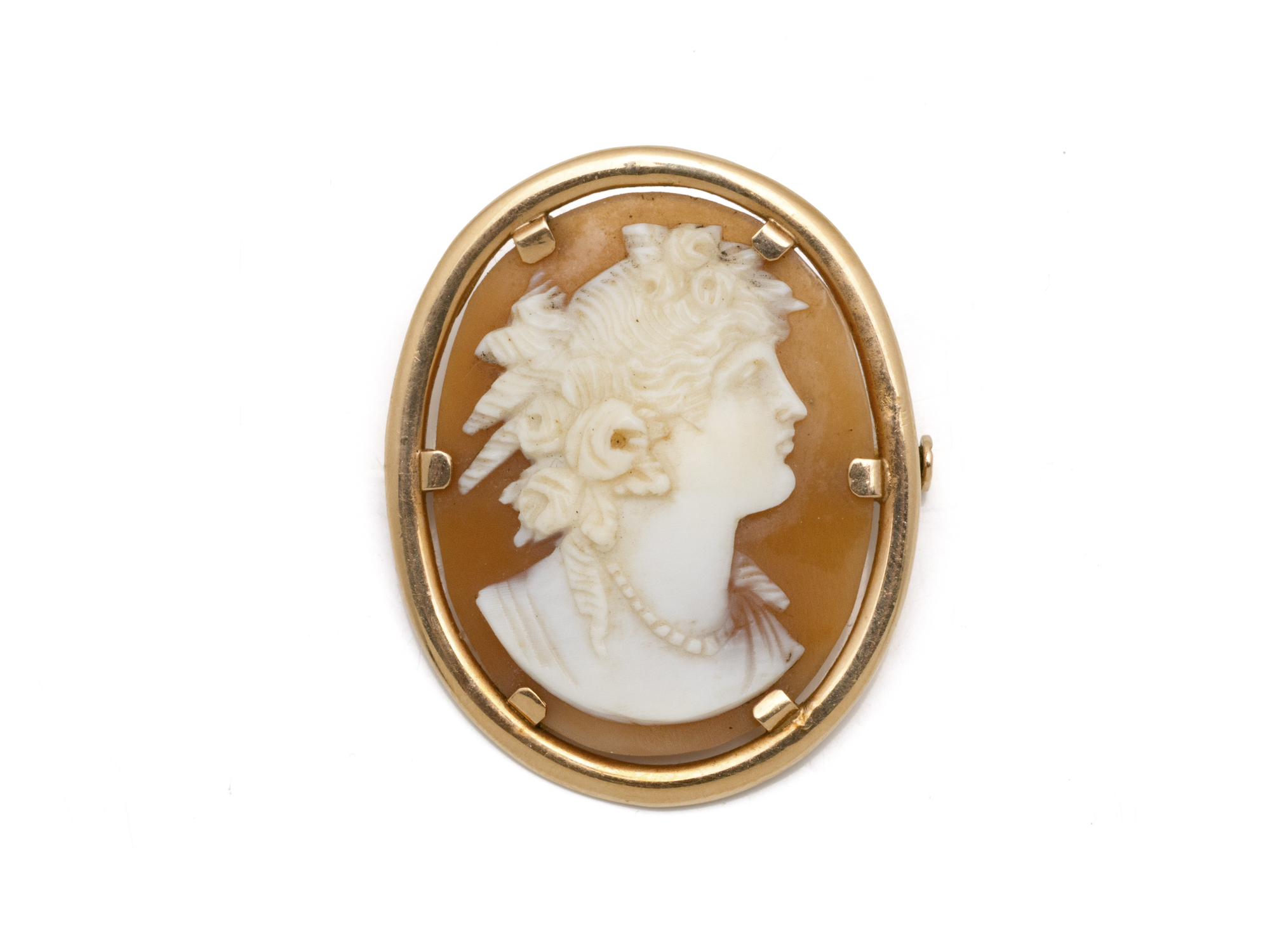 Lot n°53NV1016Broche en or 750 millièmes, ornée d'un camée coquille figurant le profil droit d'une femme coiffée en buste. Travail français. (légères déformations)