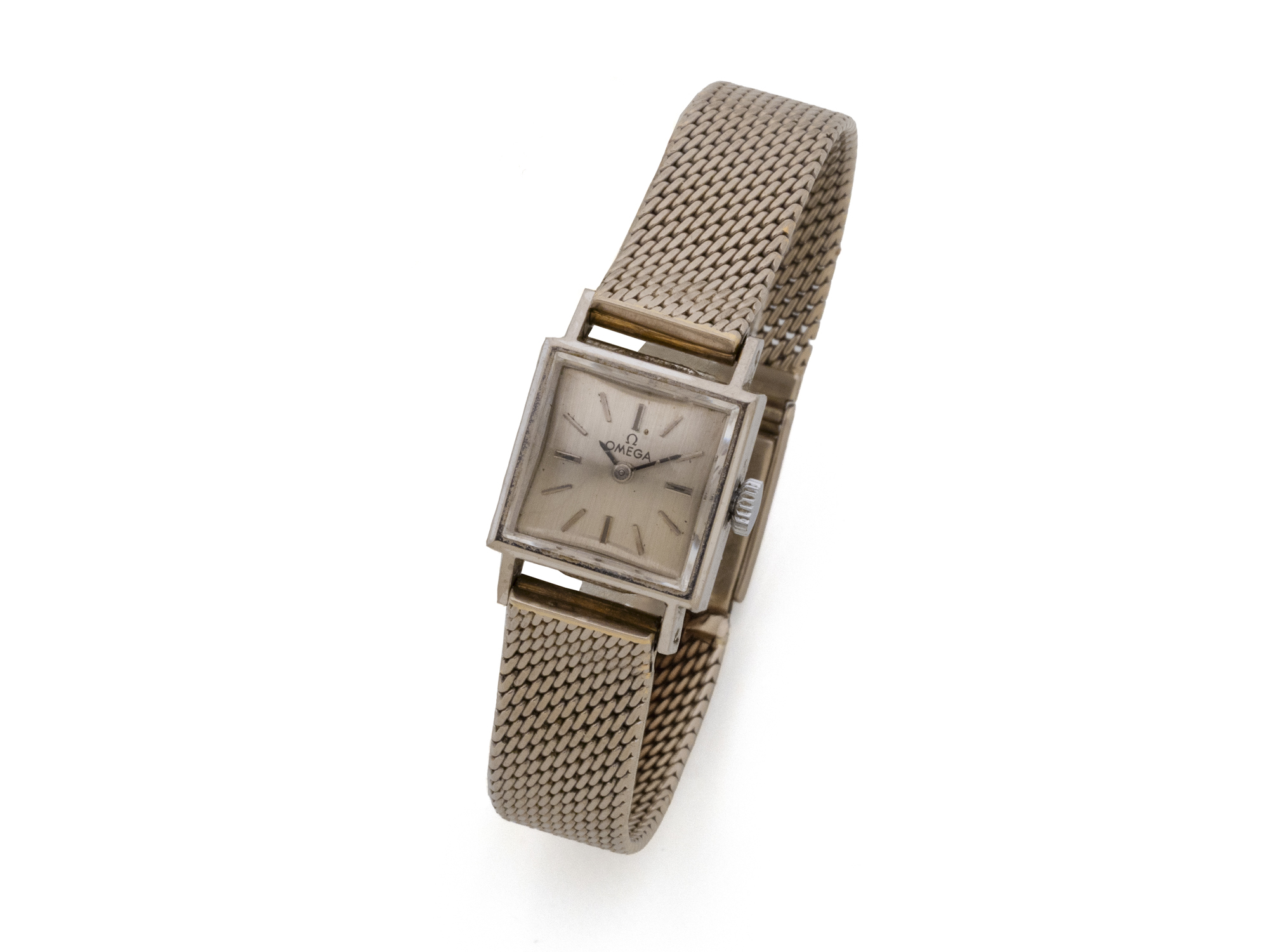 Montre bracelet de dame en or gris 750 millièmes, boîtier de forme carrée, cadran argenté avec index bâtons appliqués. Couronne probablement rapportée. Mouvement mécanique, signé, numéroté 20823071. Bracelet rapporté en or gris 750 millièmes, maillons tressés avec fermoir à cliquet en or gris 750 millièmes. Vers 1960/65. (nécessite une révision d'horlogerie pour le mouvement)