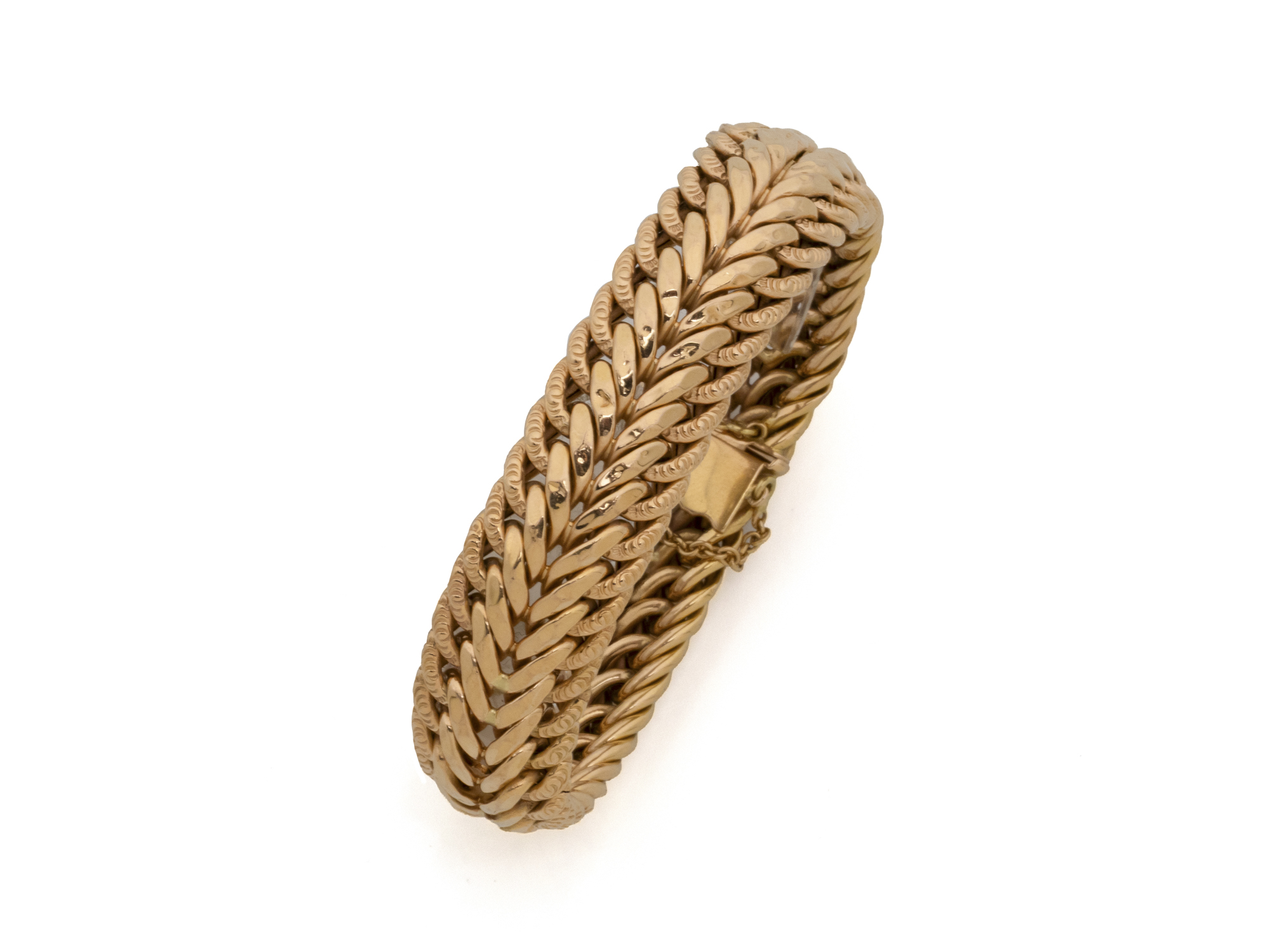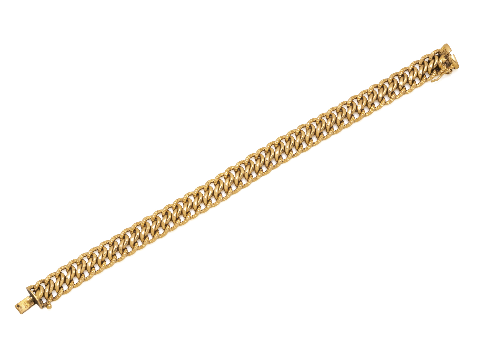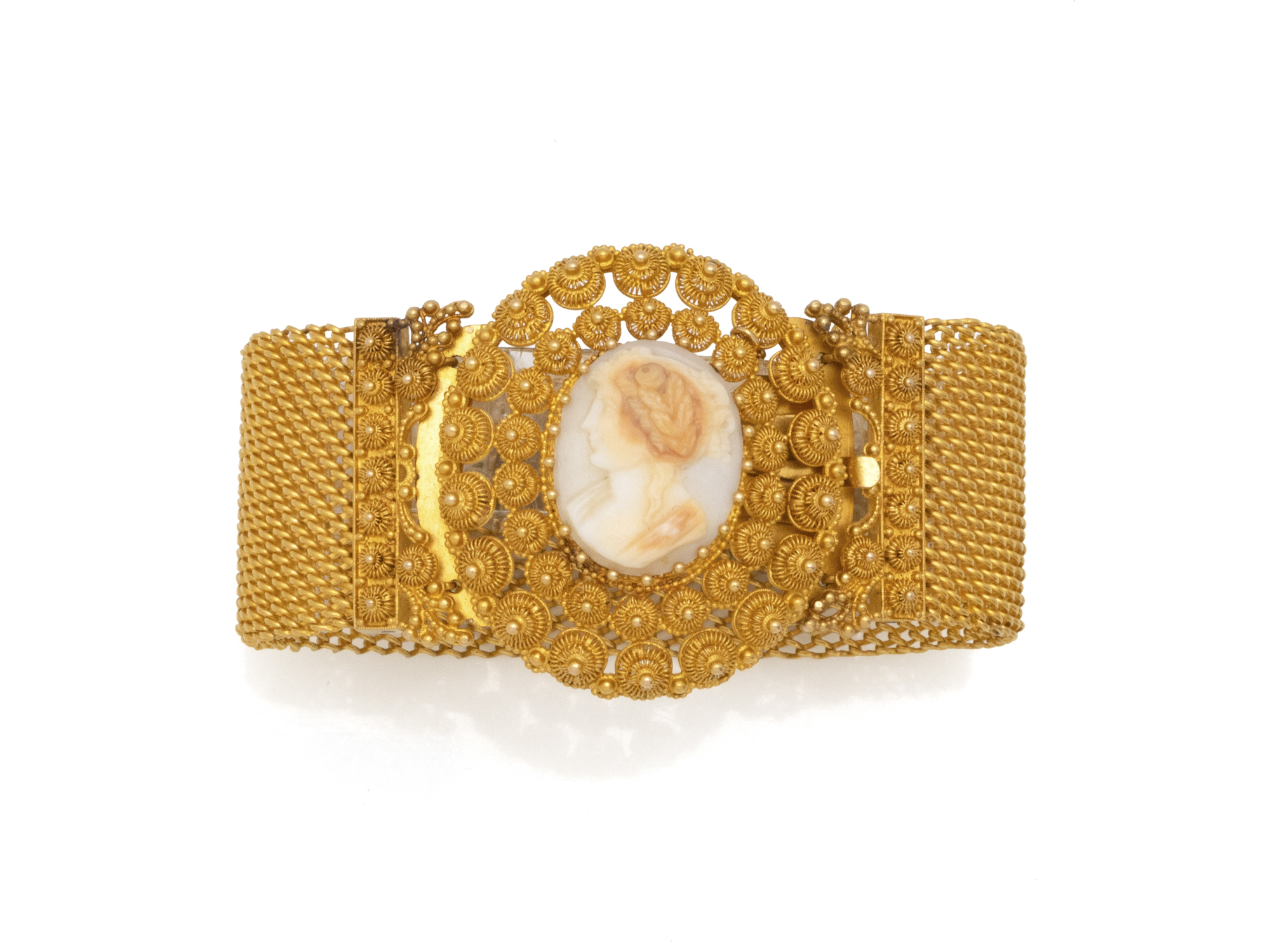 Lot n°49NV1080Bracelet en or 750 millièmes, centré d'un médaillon ovale à décor de graineti et de canetille orné d'un camée coquille figurant une femme coiffée de laurier et d'une rose. Tour de poignet maille tressée, agrémenté d'un fermoir invisible à cliquet avec chaînette de sécurité rapportée en or 750 millièmes. Travail de la fin de la première moitié du XIX° siècle. (petites usures)