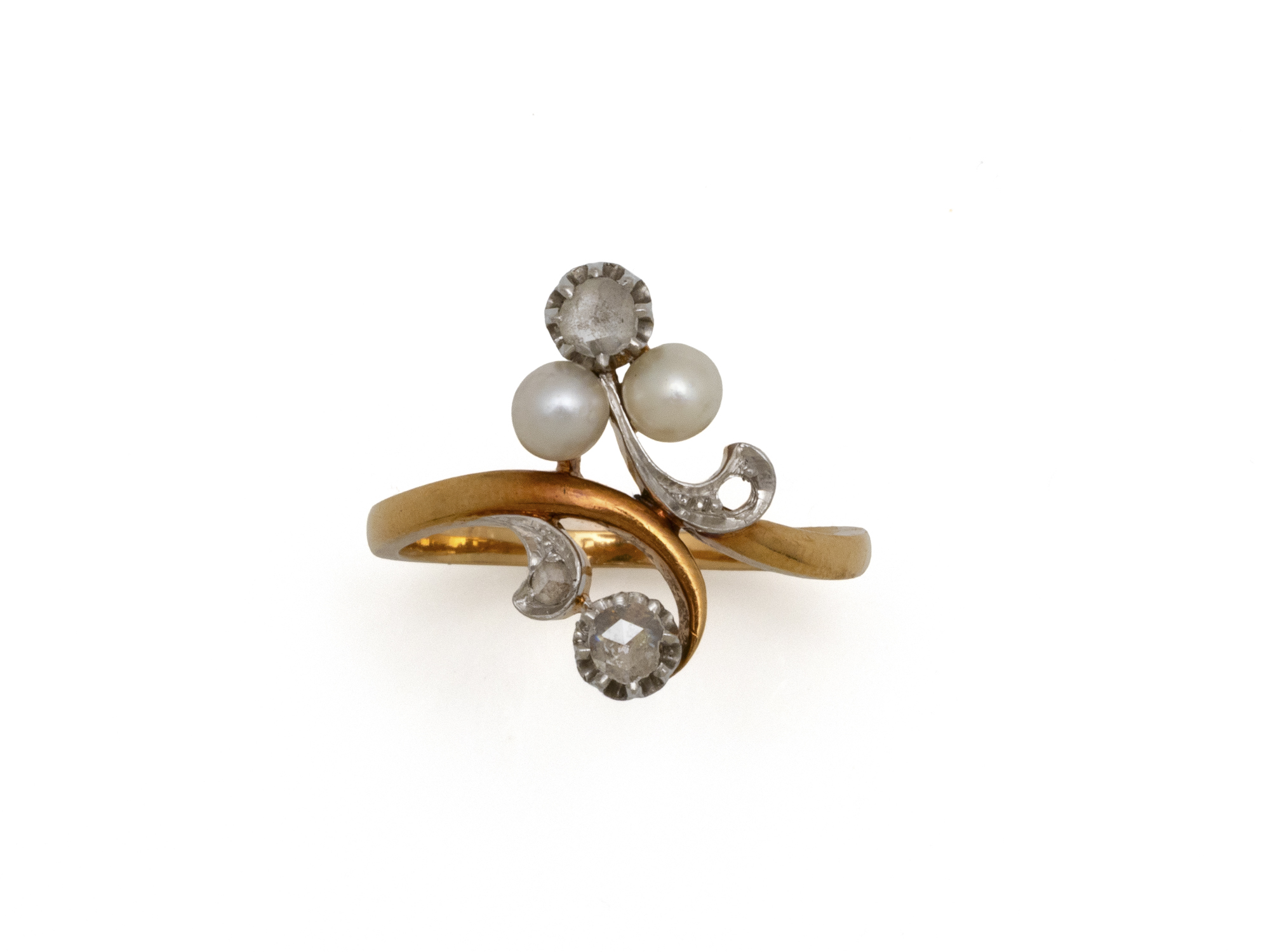 Lot n°57NV1029Bague en or 750 et platine 850 millièmes, à décor croisé d'un trèfle et feuillagé, rehaussée de 2 petites perles probablement fines et de roses couronnées. Travail français de la fin du XIX° siècle. (manque une rose)