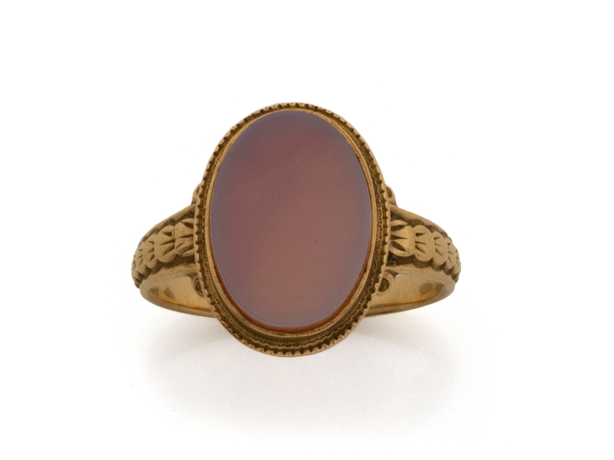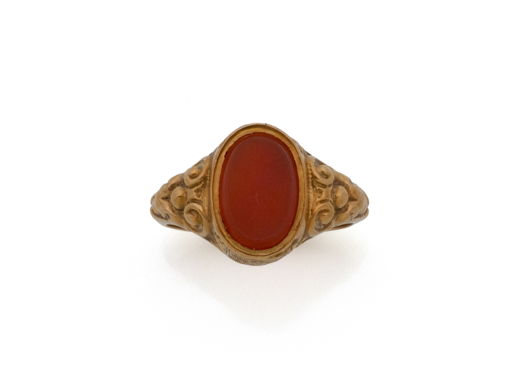 Lot n°58NV1136Bague chevalière en or 750 millièmes, ornée d'une plaque ovale en agate. Le chaton et l'épaulement finement ciselés. Travail français de la fin du XIX° siècle.