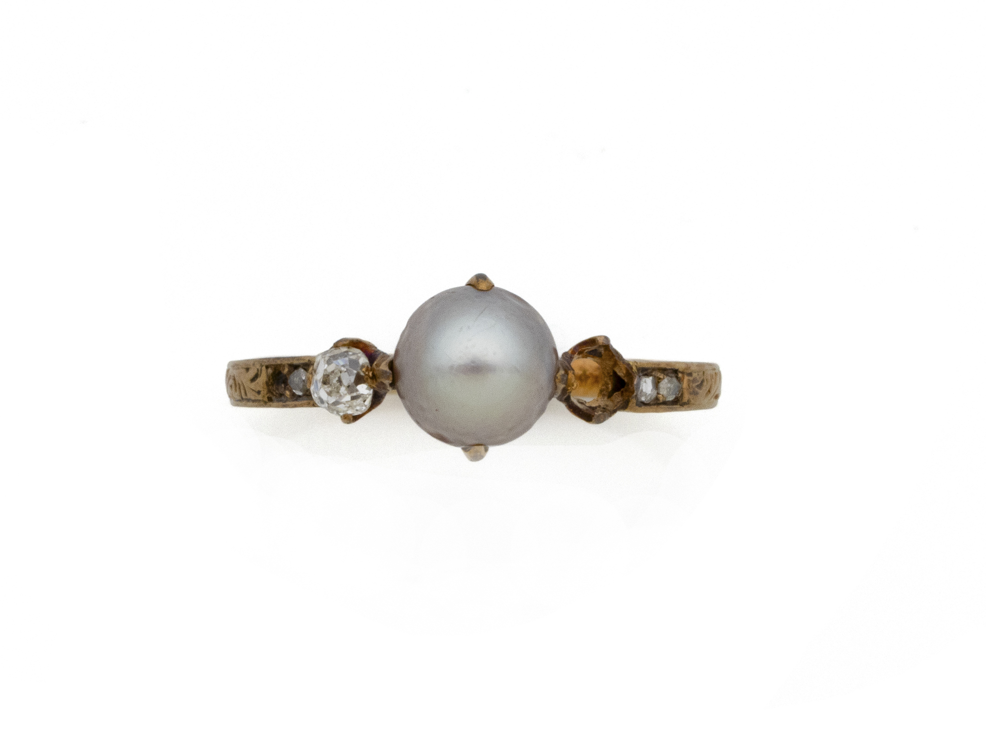 Lot n°55NV1034Bague en or 750 millièmes, ornée d'une perle bouton probablement fine d'eau douce d'environ 6.5 mm, épaulée de roses diamantées et d'un diamant taille ancienne. Corps de bague finement ciselé à décor feuillagé, gravé à l'intérieur ''20 Juillet 1850''. (manques sur les diamants)
