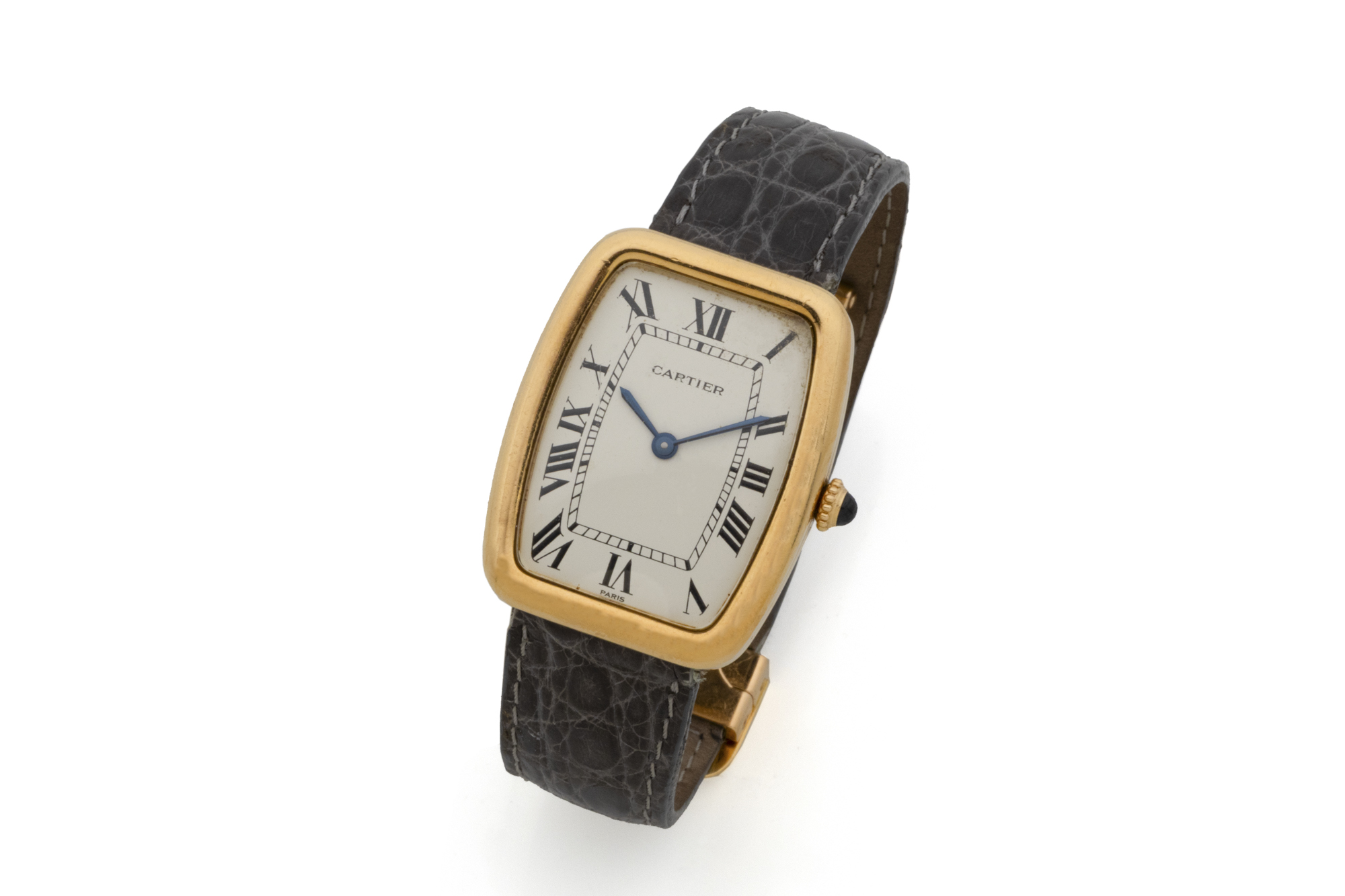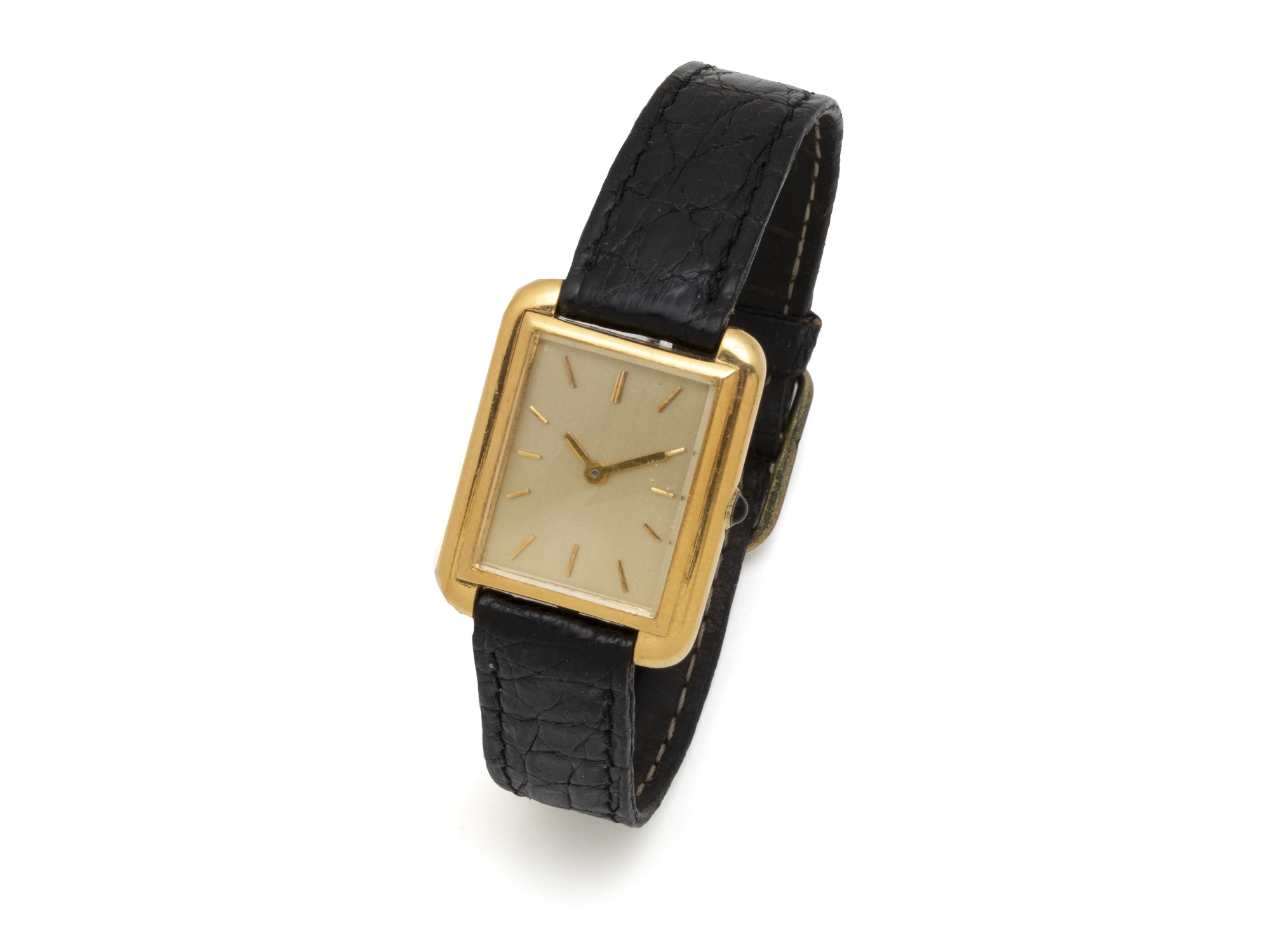 Montre bracelet d'homme en or 750 millièmes, boîtier de forme tonneau, cadran émaillé blanc avec chiffres romains peints, chemin de fer pour les minutes, aiguilles glaive en acier bleui. Lunette godronnée. Couronne perlée, ponctuée d'un cabochon de saphir. Mouvement mécanique signé. Bracelet cuir avec boucle déployante en or 750 millièmes, signée. Vers 1970. (rayures)