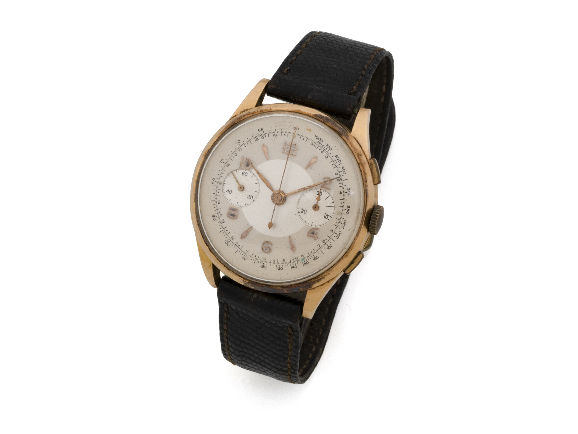 Lot n°220NV1046Montre chronographe en or 750 millièmes, boîtier de forme ronde, cadran ivoire 2 compteurs avec chiffres arabes et index flèches en relief, échelles tachymétrique et télémétrique. Mouvement mécanique, calibre Landron. Bracelet rapporté en cuir accidenté avec boucle ardillon en métal doré. Vers 1950. (en l'état, manque le cache poussière)