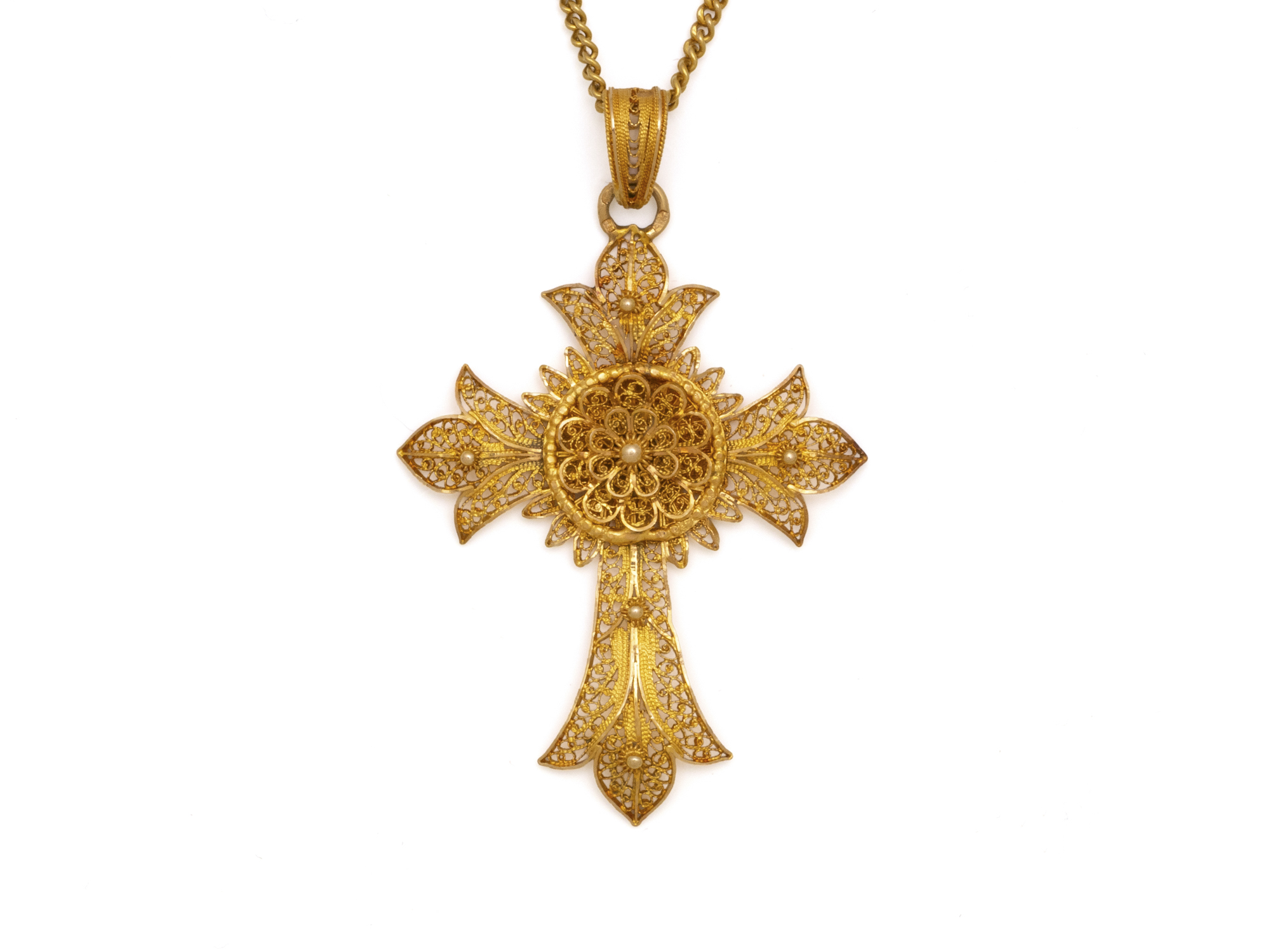 Lot n°52NV1060Pendentif en or 750 millièmes filigrané, retenant une croix. Il est accompagné d'une chaîne en or 750 millièmes, maille gourmette avec fermoir anneau ressort.