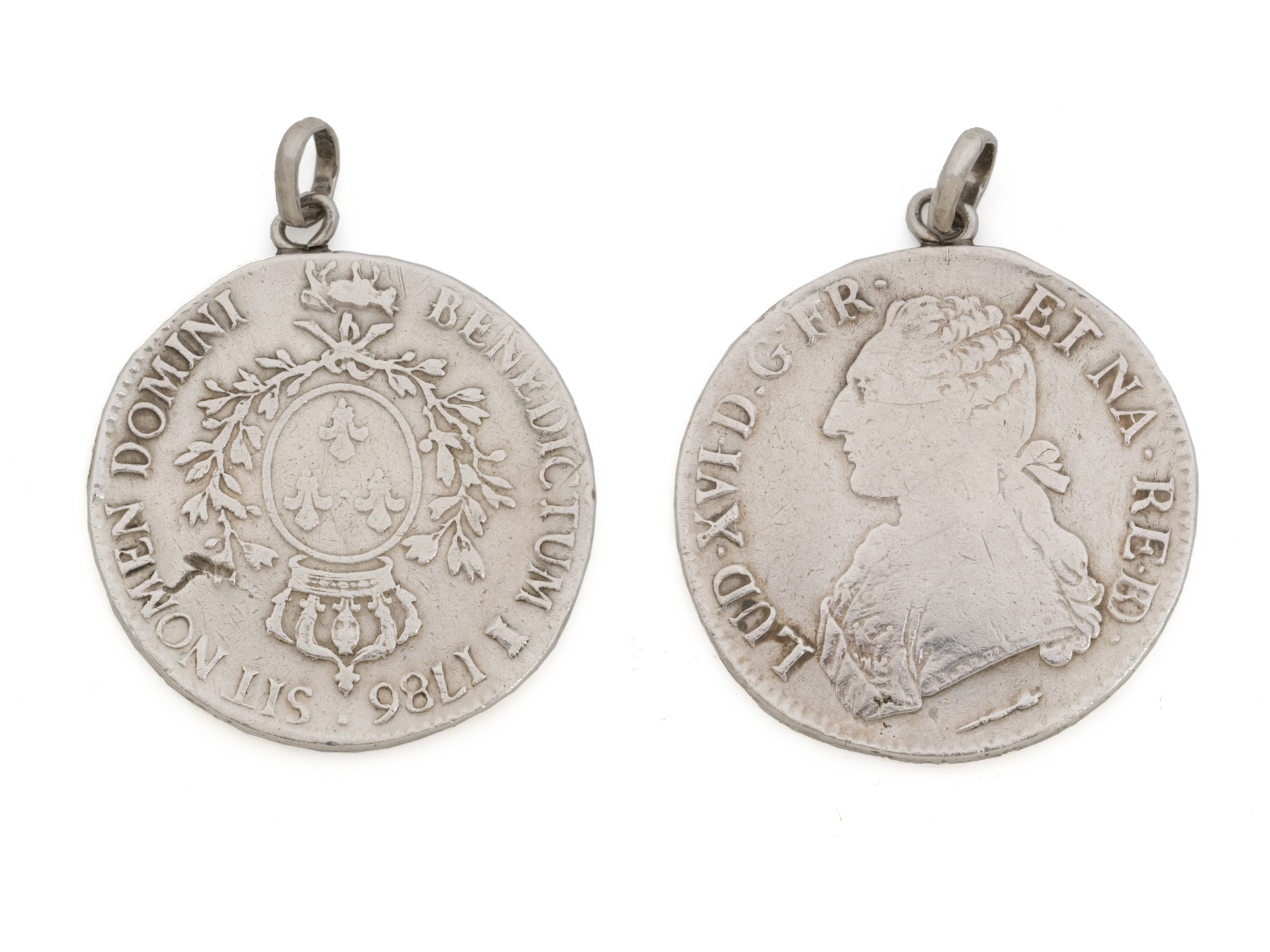 Lot n°7NV1062Pendentif en argent 800 millièmes retenant un Écu Louis XVI aux branches d'olivier en argent, daté 1786. (en l'état)