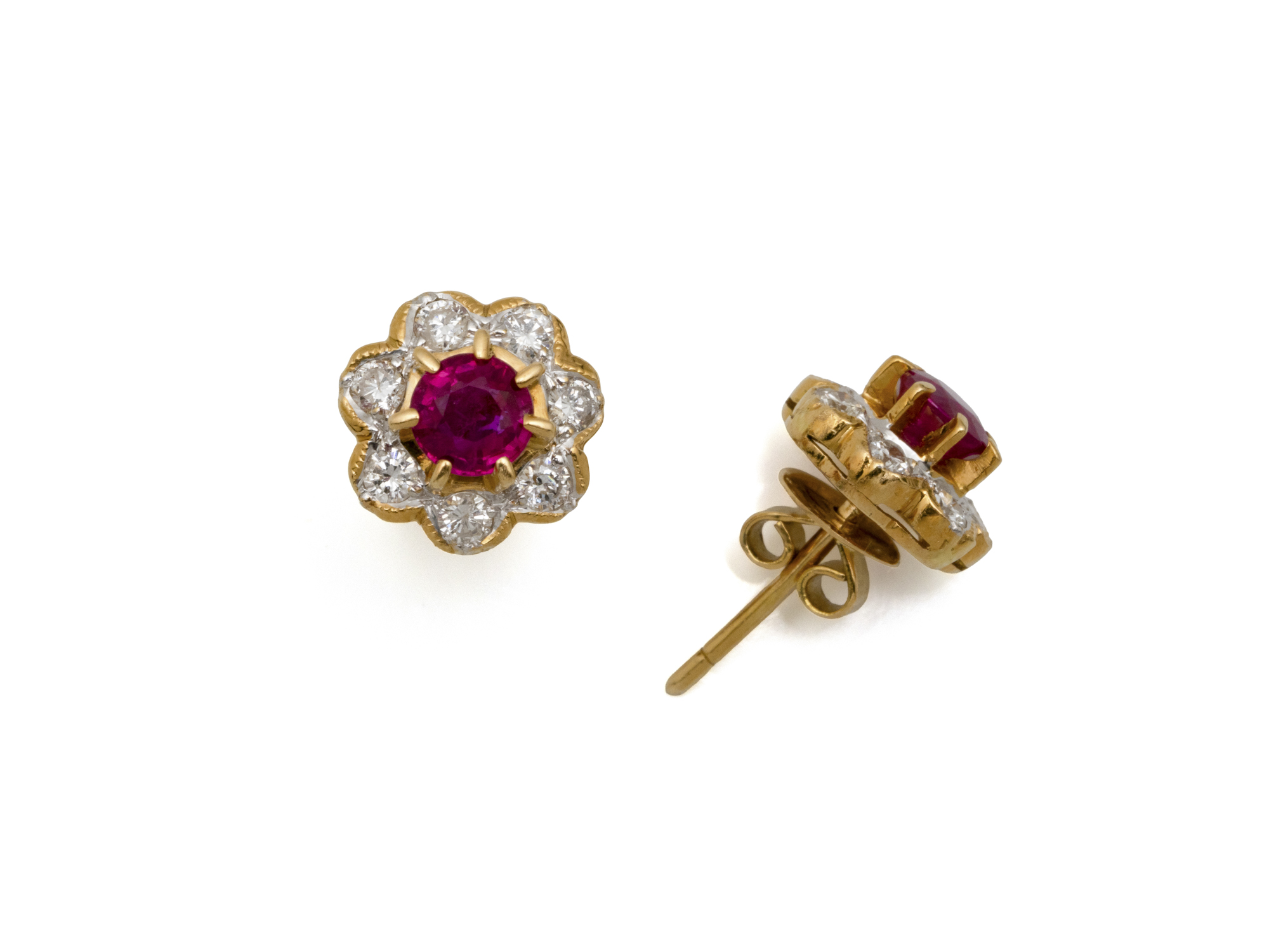 Lot n°77NV1066Paire de boucles d'oreilles en or 750 millièmes stylisant une fleurette, ornées d'un rubis rond facetté en serti griffe dans un entourage festonné rehaussé de diamants brillantés. Travail français.