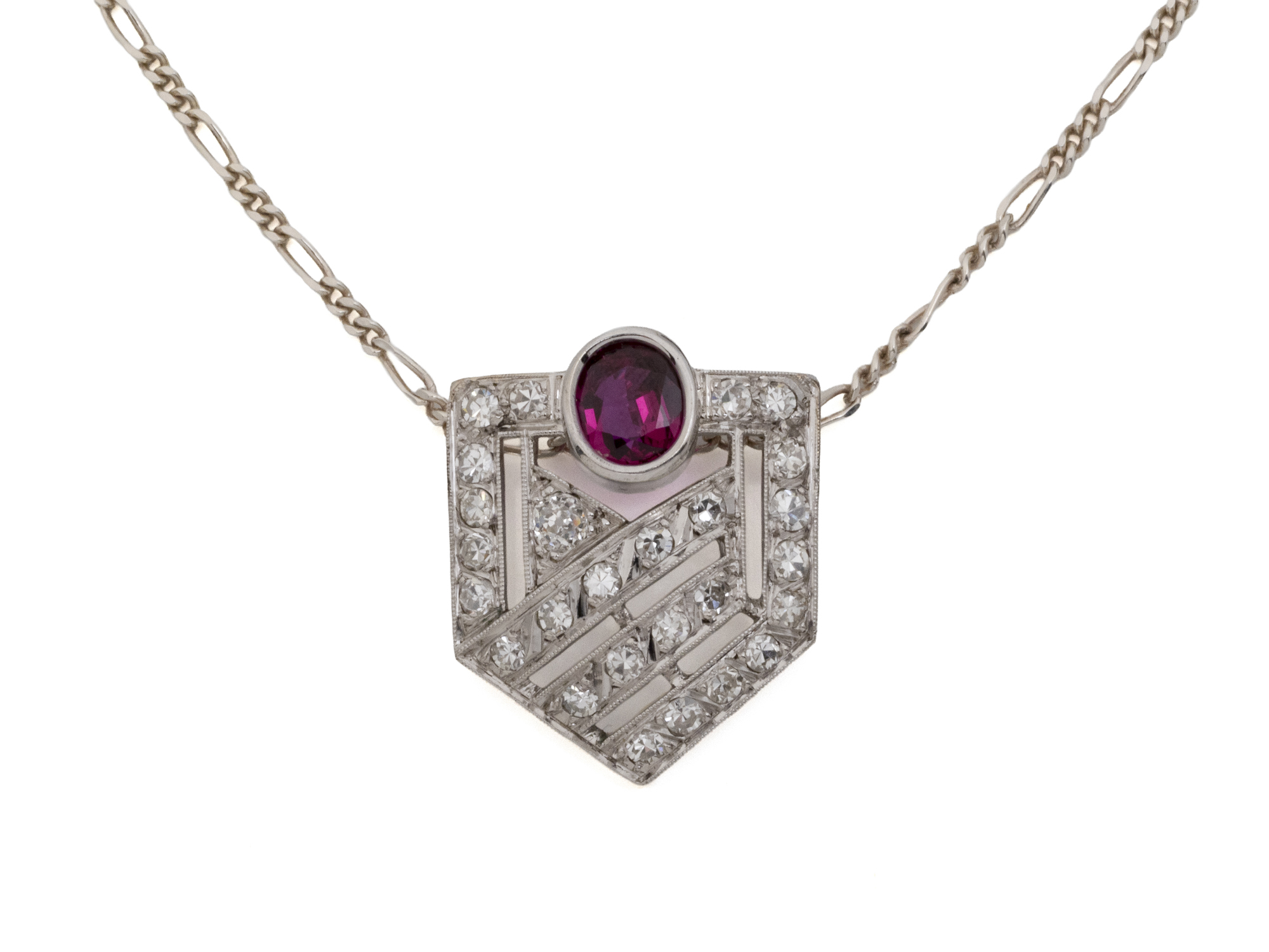 Lot n°76NV1067Pendentif en or 750 et platine 850 millièmes, à décor géométrie ajouré, orné d'un rubis ovale facetté en serti clos dans un pavage rehaussé de diamants taille 8/8 et d'un diamant taille ancienne. Dans le goût Art Déco.