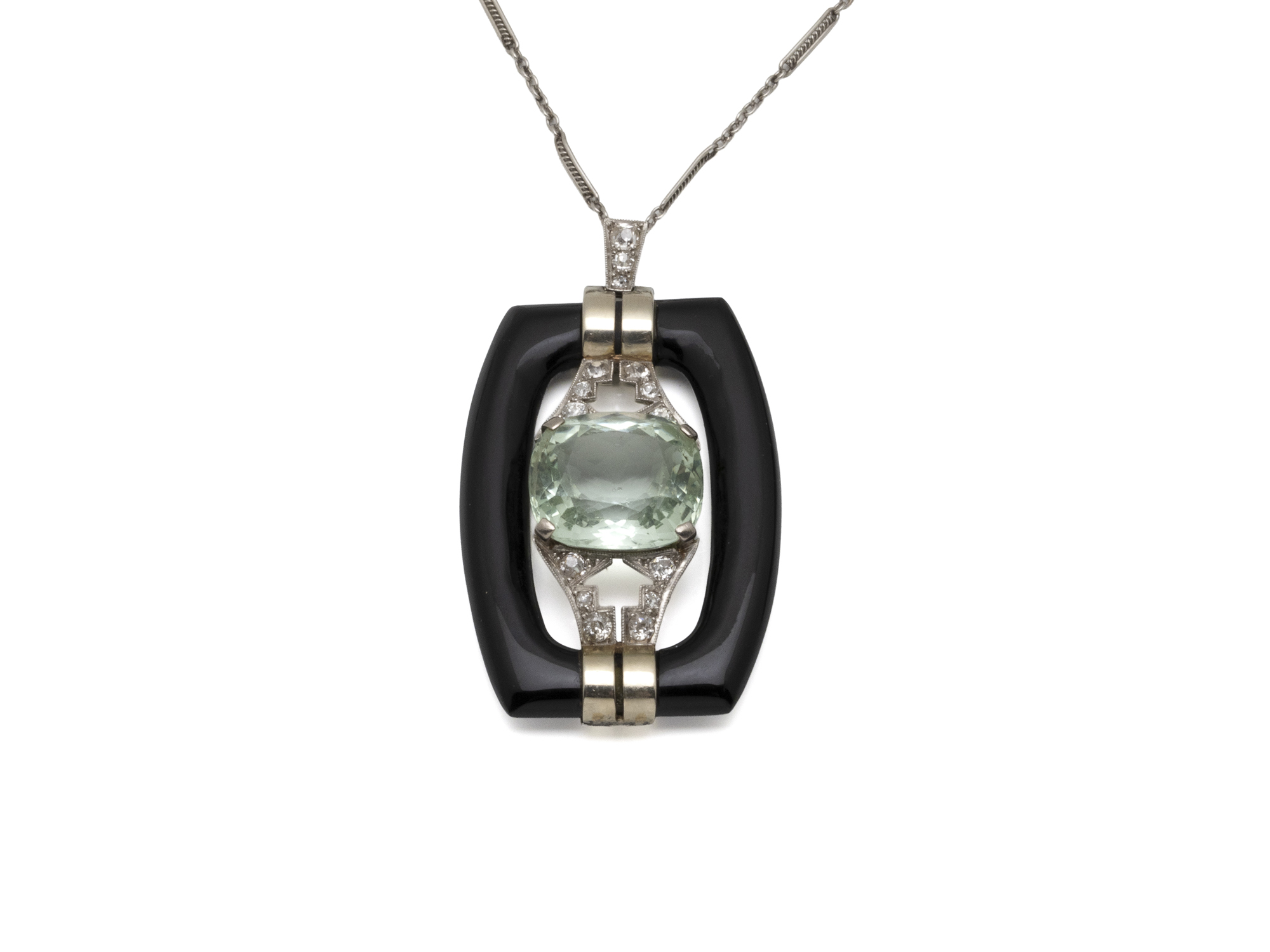 Lot n°74NV1070Pendentif en or gris 585 et platine 850 millièmes, de forme tonneau, centré d'une aigue-marine taille coussin facettée en serti griffe posée sur un décor géométrique rehaussé de diamants taille ancienne, entouré d'un motif en pâte de verre imitant l'onyx. La bélière diamantée. Il est retenu par une chaîne en or gris 750 millièmes, composée de petits bâtonnets à décor torsadé, alternés de brins maille forçat, avec fermoir anneau ressort. Vers 1930. (petites usures à la chaîne)