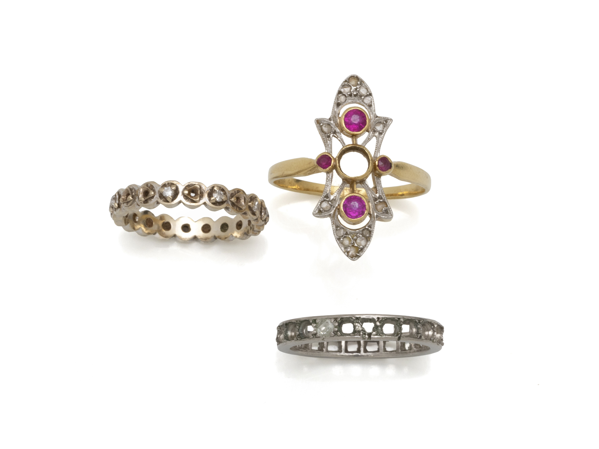Lot n°65NV1071Lot en or 750 et platine 850 millièmes, composé d'une bague marquise et de 2 alliances américaines. L'ensemble rehaussé de diamants taille 8/8, de roses diamantées et de pierres rouges pour la marquise. (en l'état, manques sur les pierres)