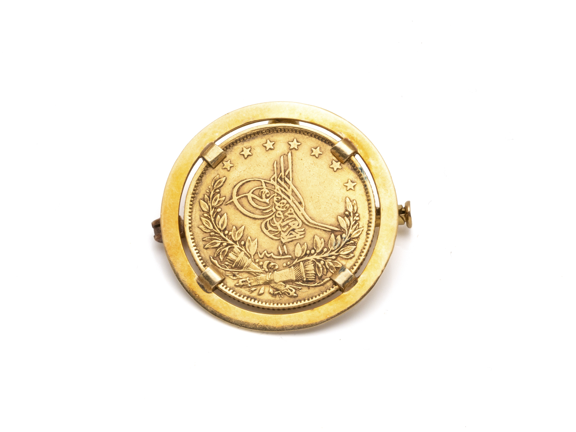 Lot n°20NV1083Broche pendentif en or 750 millièmes, retenant une pièce de 100 Kurush en or de l'Empire ottoman Travail français pour la monture.