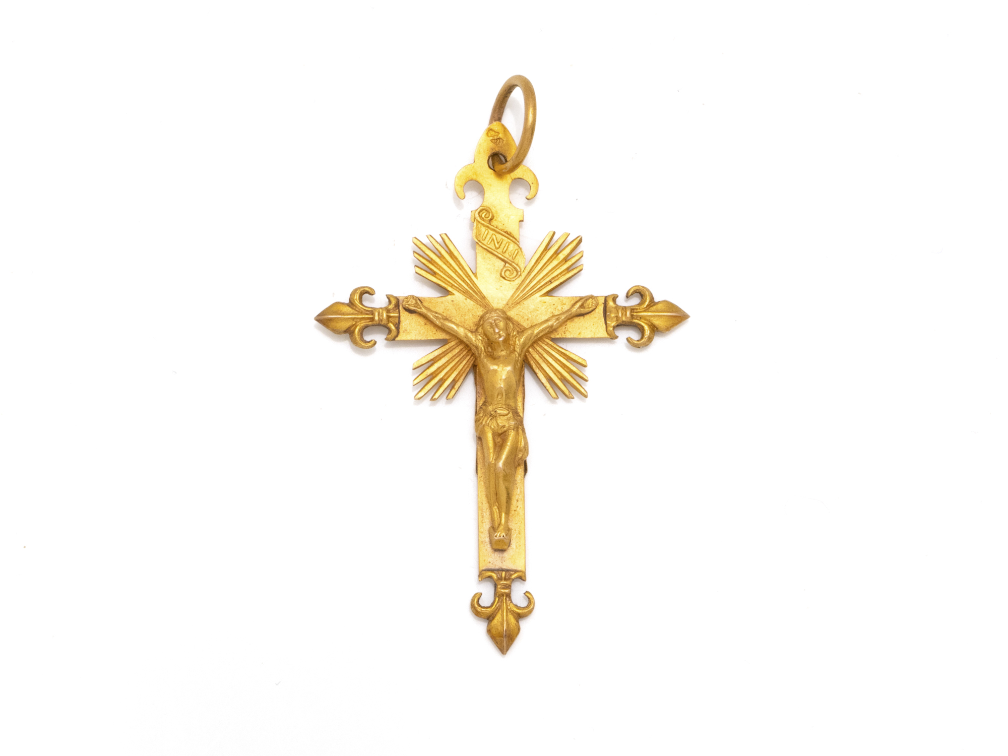 Lot n°46NV1084Pendentif Croix de Val de Loire en or 750 millièmes, retenant un Christ dans un décor rayonnant et de fleur de lys. Au dos, une Vierge à l'enfant finement ciselée. Travail français du XIX° siècle.