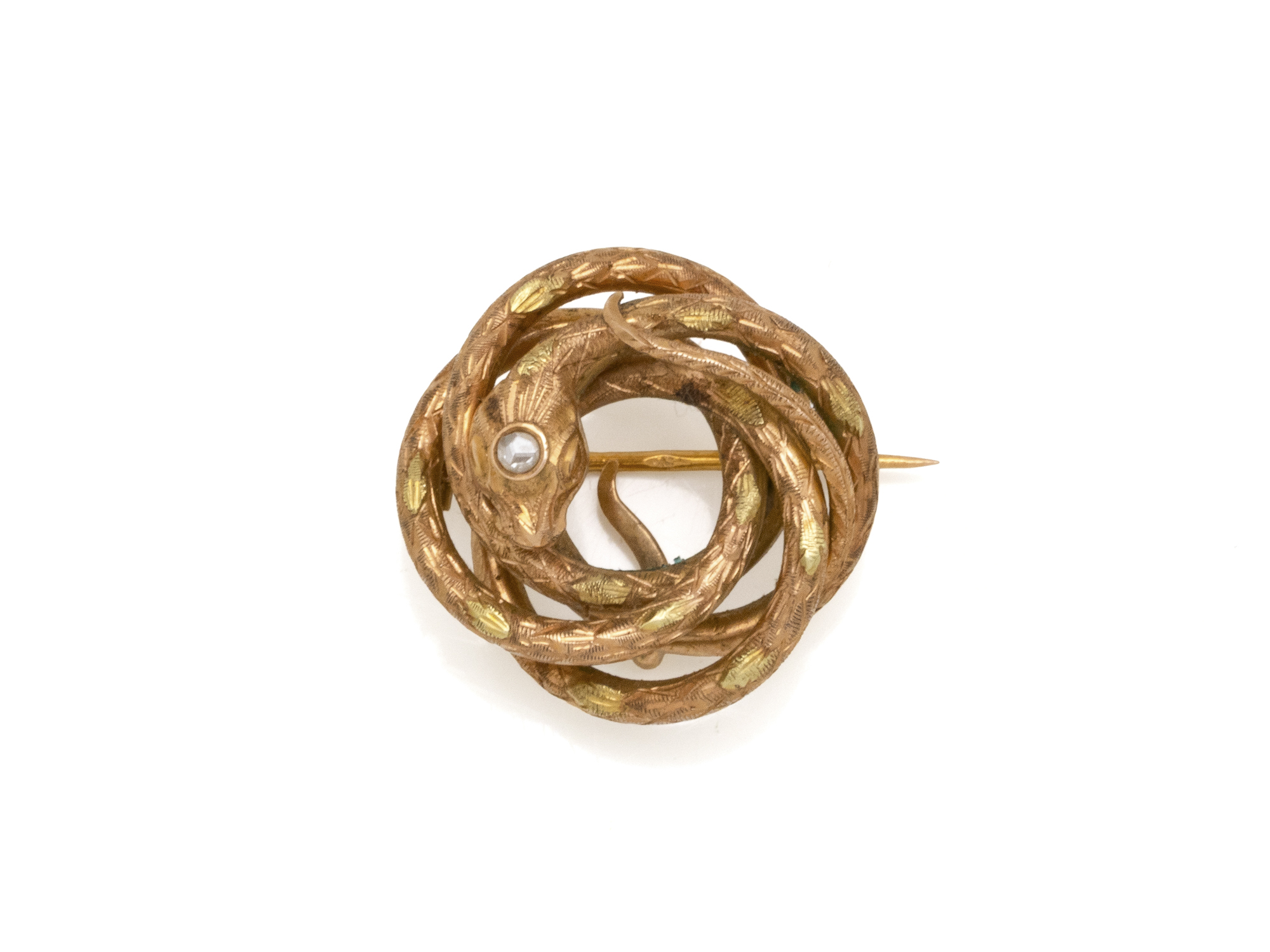 Lot n°45NV1085Broche 2 tons d'or 750 millièmes, stylisant un serpent finement ciselé et enroulé sur lui-même, la tête ponctuée d'une rose couronnée en serti clos. Travail français de la fin du XIX° siècle.