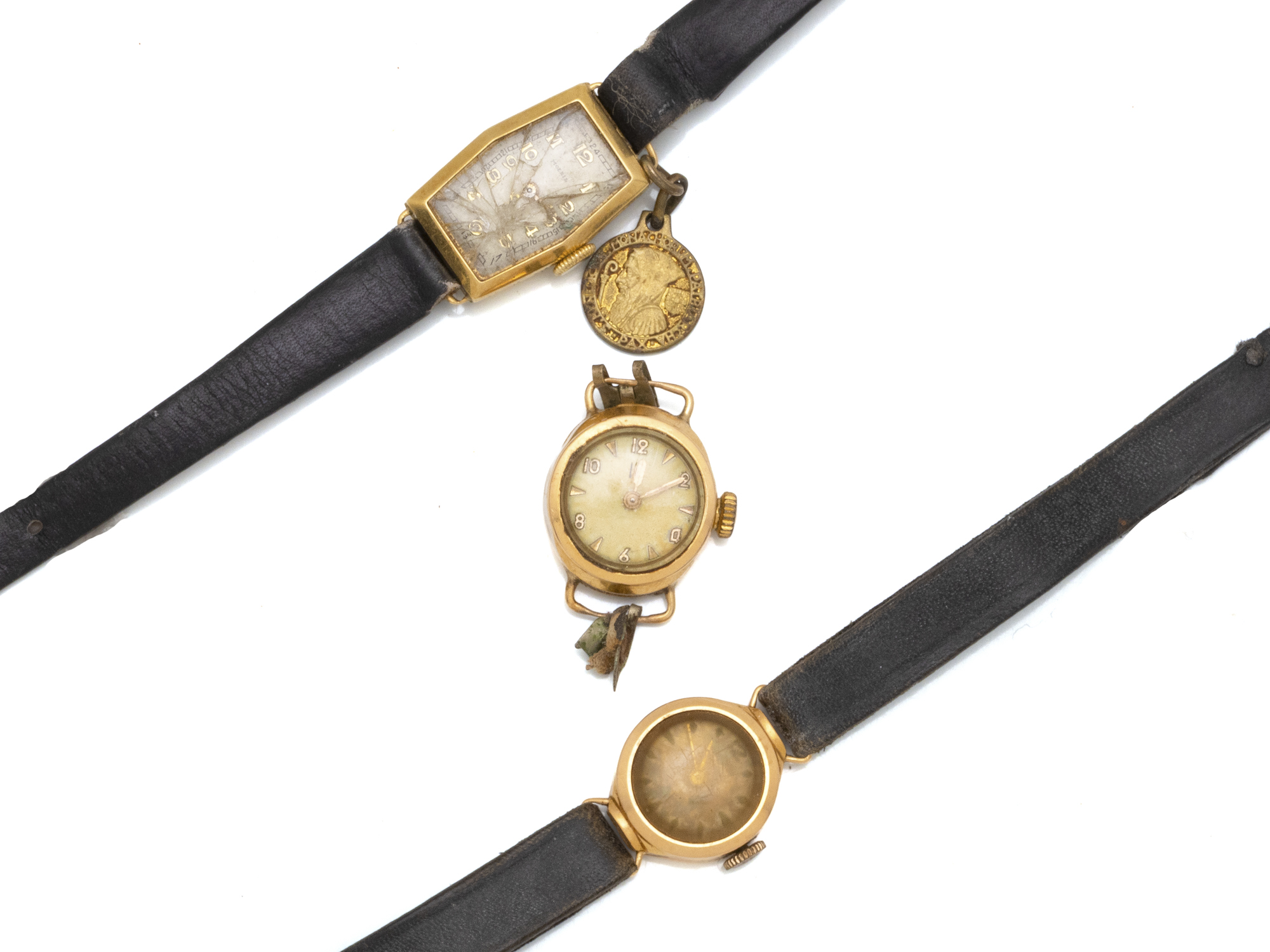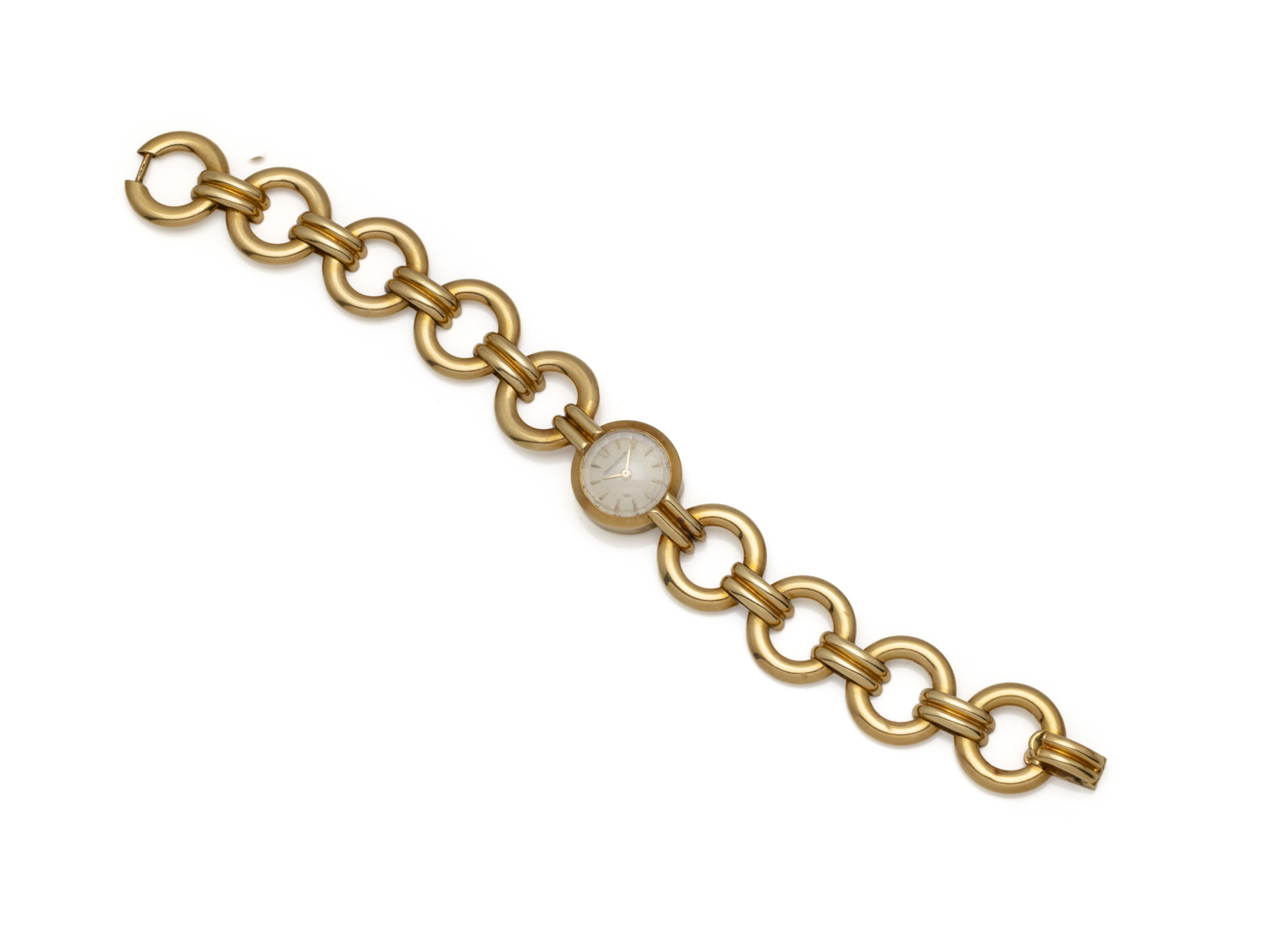 Montre bracelet de dame en or 750 millièmes, cadran ivoire taché avec index bâtons appliqués. Mouvement mécanique signé, numéroté 14450832. Bracelet rapporté en or 750 millièmes, maillons tressés à décor satiné avec fermoir à cliquet en or 750 millièmes. Boîte française. Vers 1955. (en l'état pour le mouvement)