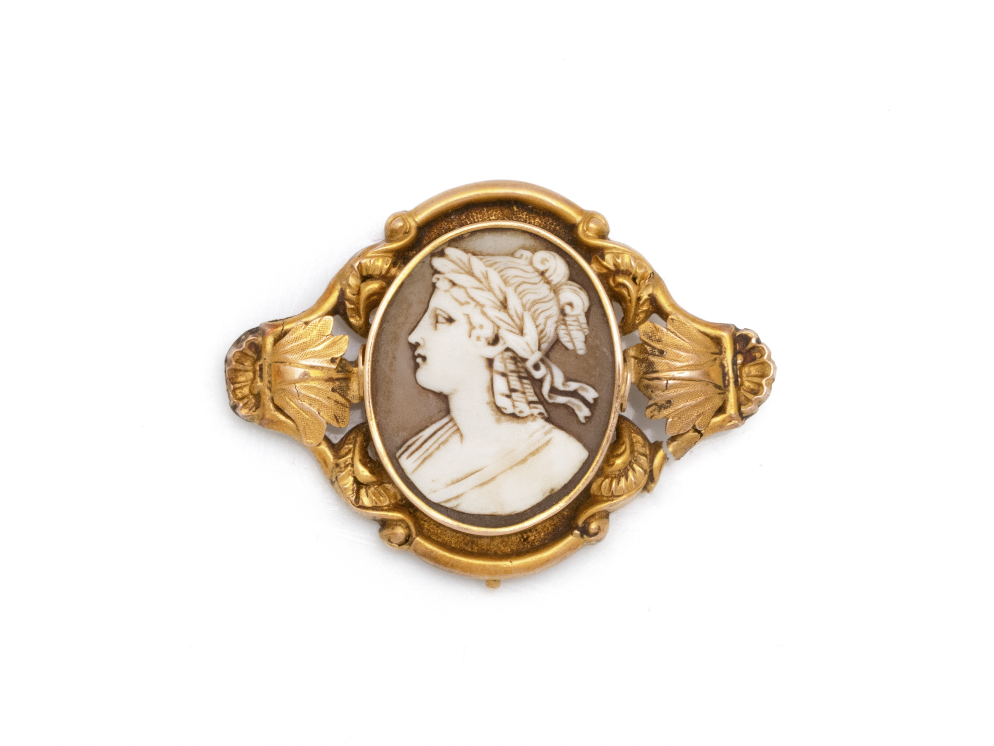 Lot n°47NV1087Broche en or 750 millièmes estampé, centrée d'un camée coquille gravé du profil gauche d'un personnage couronné de laurier. La monture à décor de rocaille et de palmes. L'épingle en métal. Travail français de la fin de la première moitié du XIX° siècle. (en l'état)