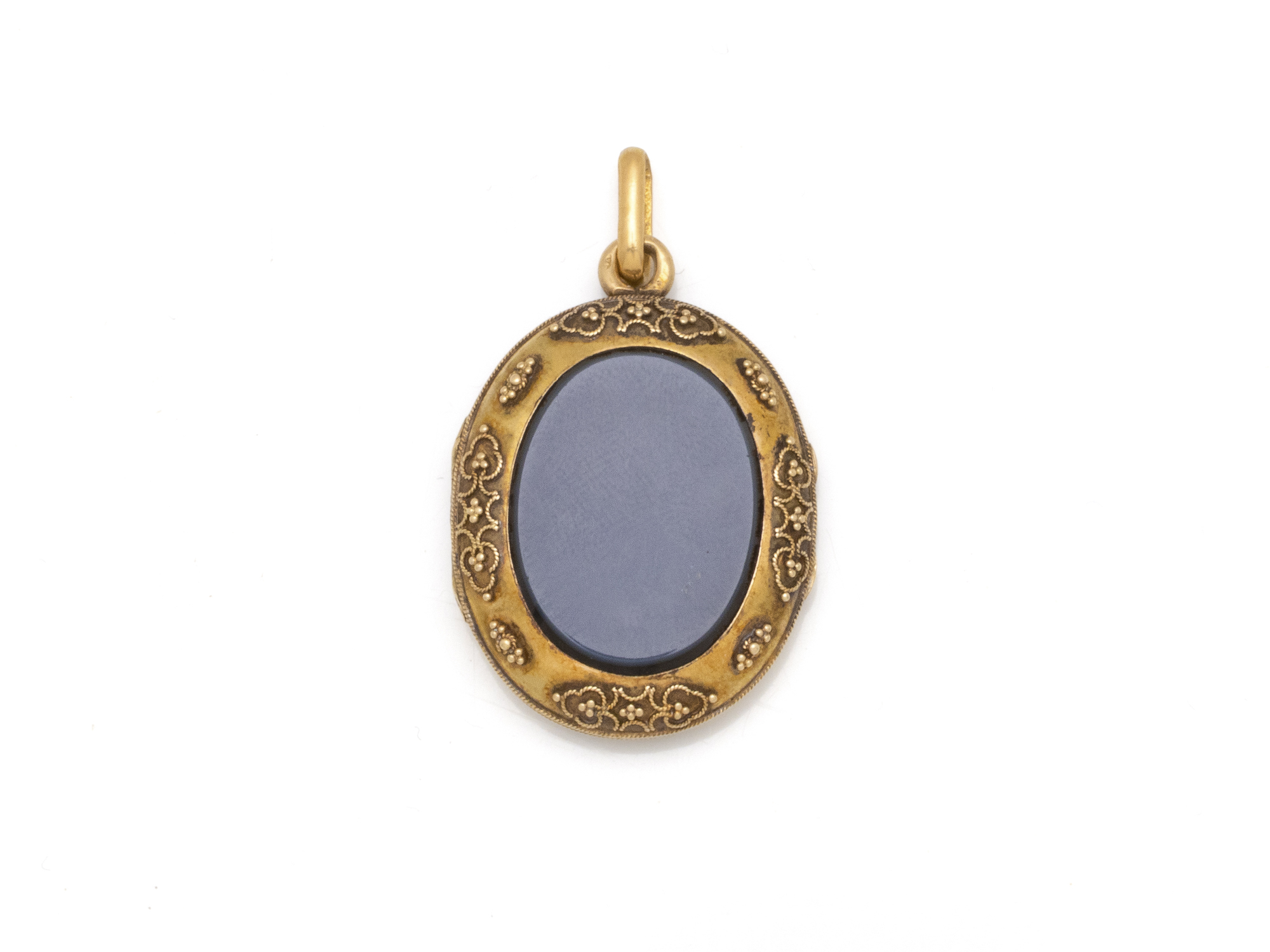 Lot n°48NV1088Pendentif porte-photo en or 750 millièmes, retenant un médaillon ovale ouvrant orné de 2 plaques d'agate. La monture à décor filigrané et de graineti. Travail français de la fin du XIX° siècle. (légères bosses)