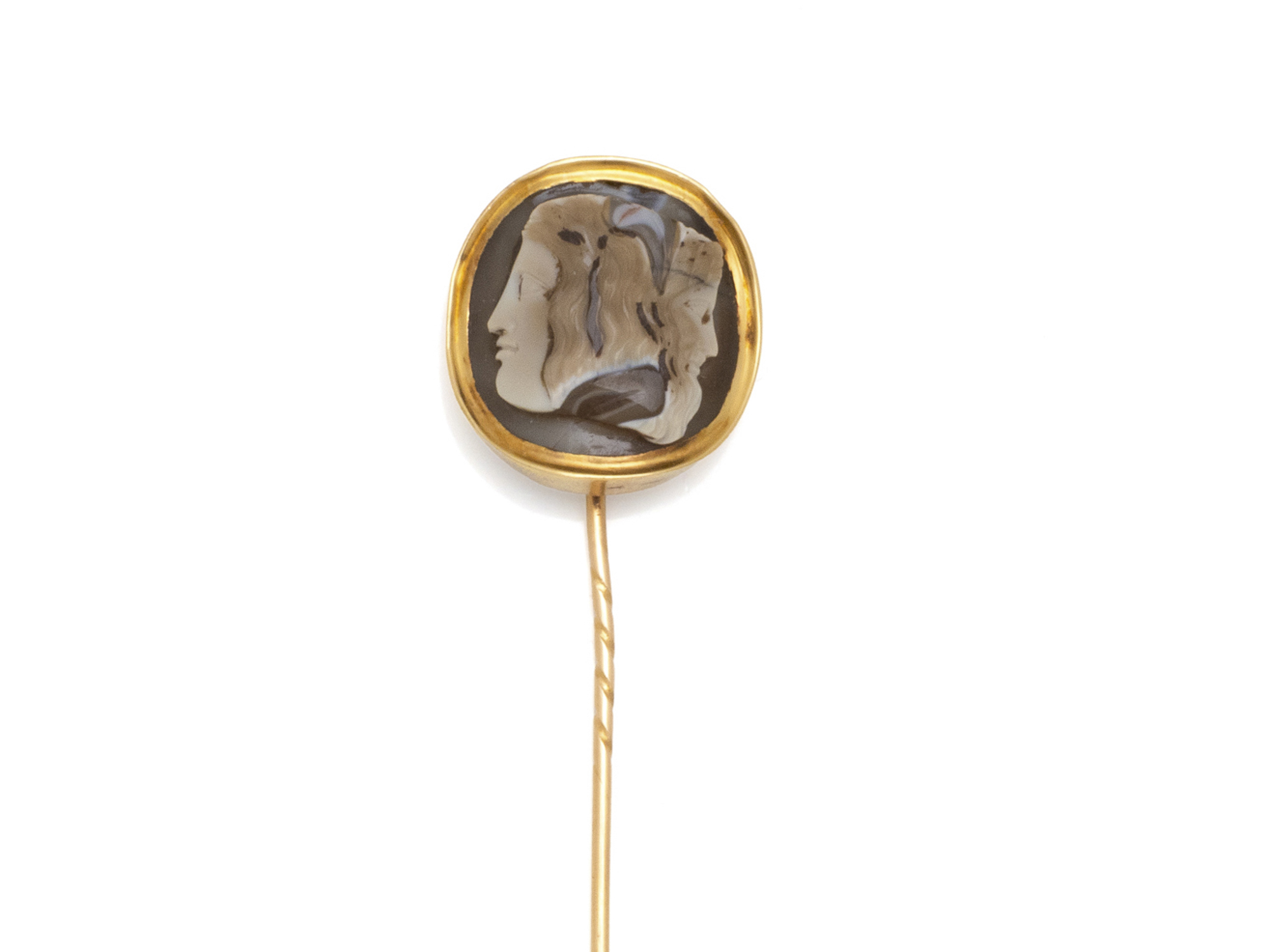 Lot n°42NV1090Épingle de cravate en or 750 millièmes, ornée d'un médaillon ovale retenant un beau camée agate 3 couches gravé des profils mêlé de 2 personnages, les regards tournés vers l'extérieure. Travail probablement de la fin du XVIII°, début XIX° siècle pour le camée. (léger fêle de structure affleurant)