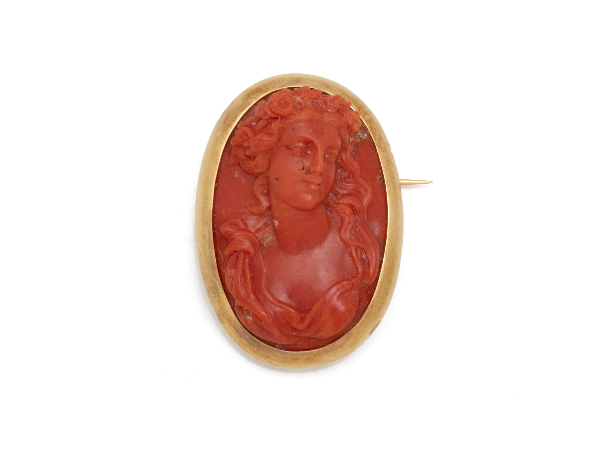Lot n°43NV1091Broche pendentif en or 750 millièmes de forme ovale, ornée d'un camée en corail gravé d'une jeune femme en buste à l'antique et à la belle chevelure coiffée de roses. Travail de la seconde moitié du XIX° siècle.