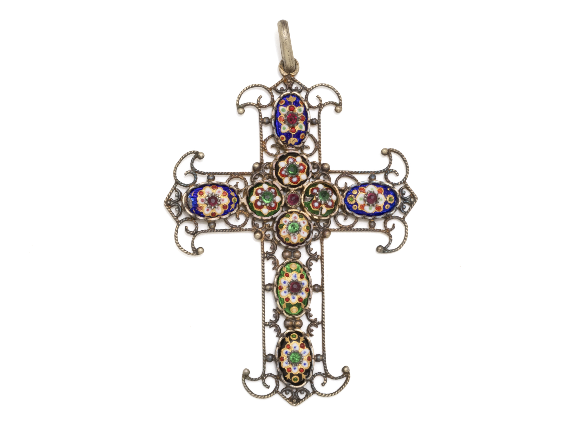 Lot n°44NV1092Pendentif en vermeil 800 millièmes, retenant une croix décorée d'émaux bressans et de verroterie. (égrisures)