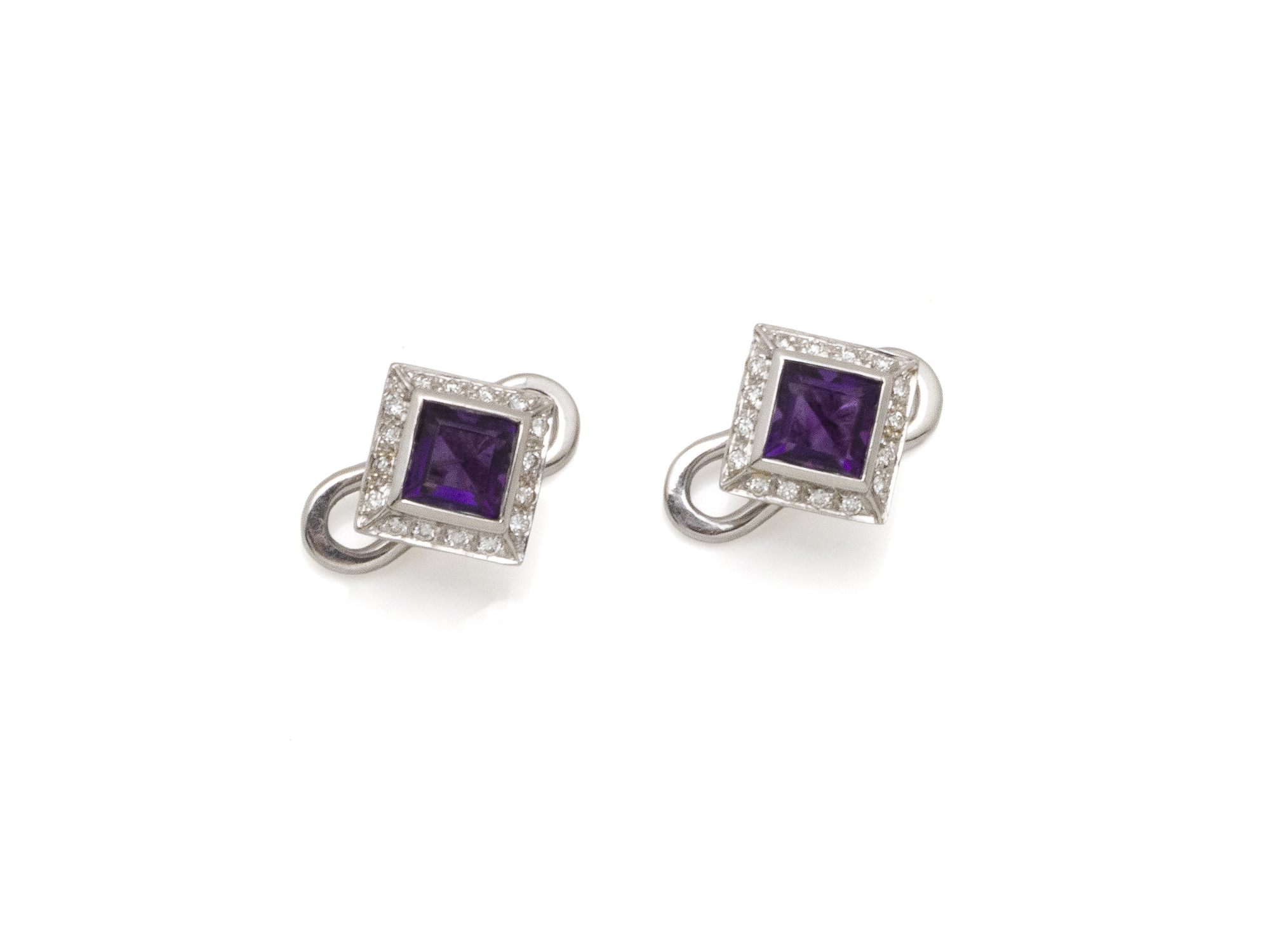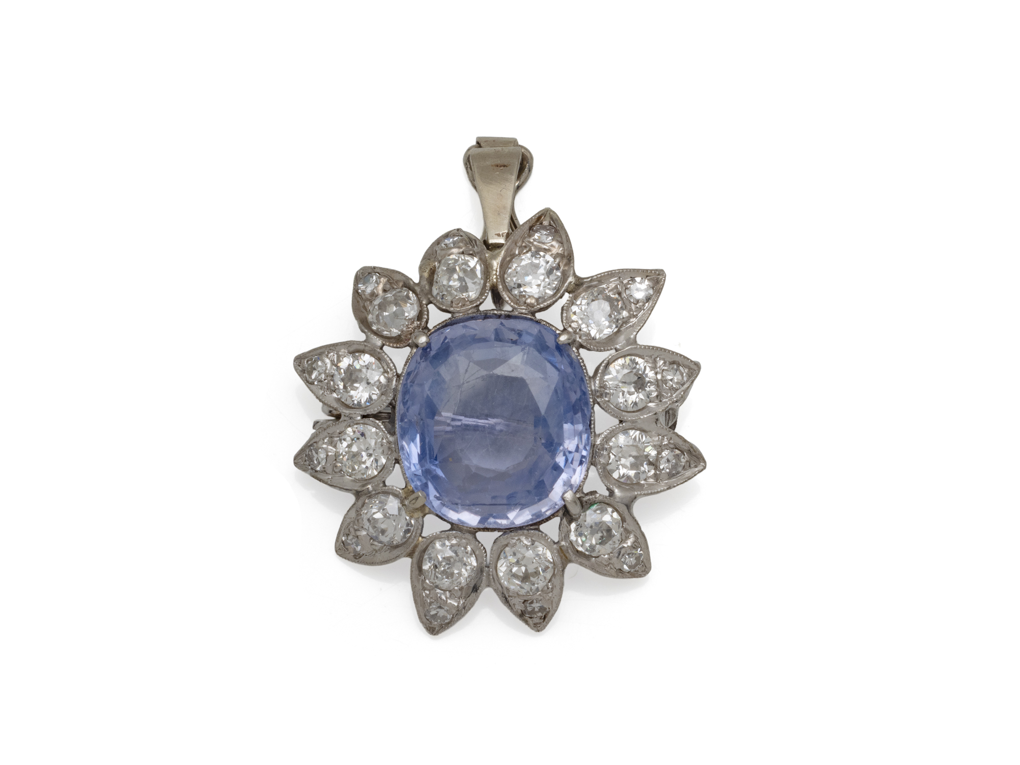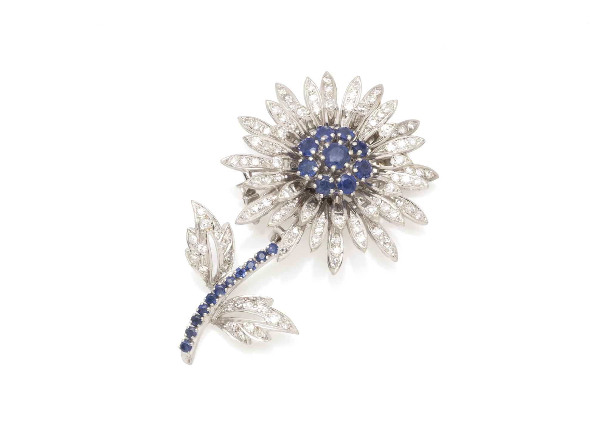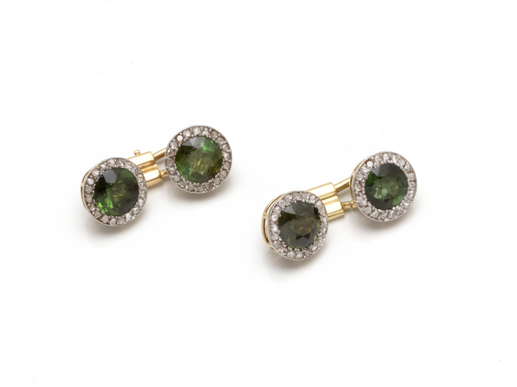 Lot n°73NV1142Paire de boutons de manchettes en platine 850 et or 750 millièmes à décor floral, habillés de diamants brillantés rehaussés d'un motif triangulaire ponctué d'un saphir. Vers 1930.