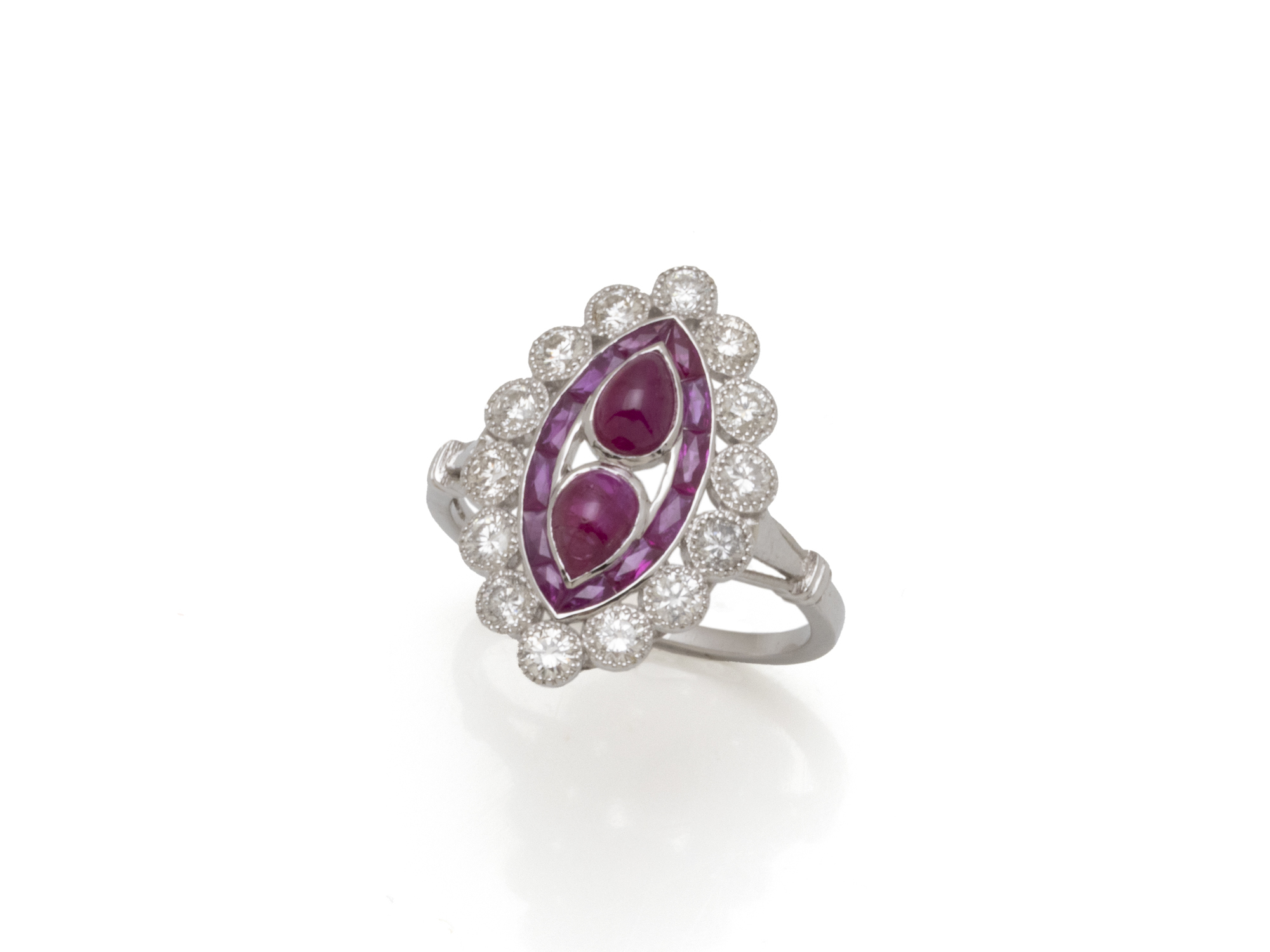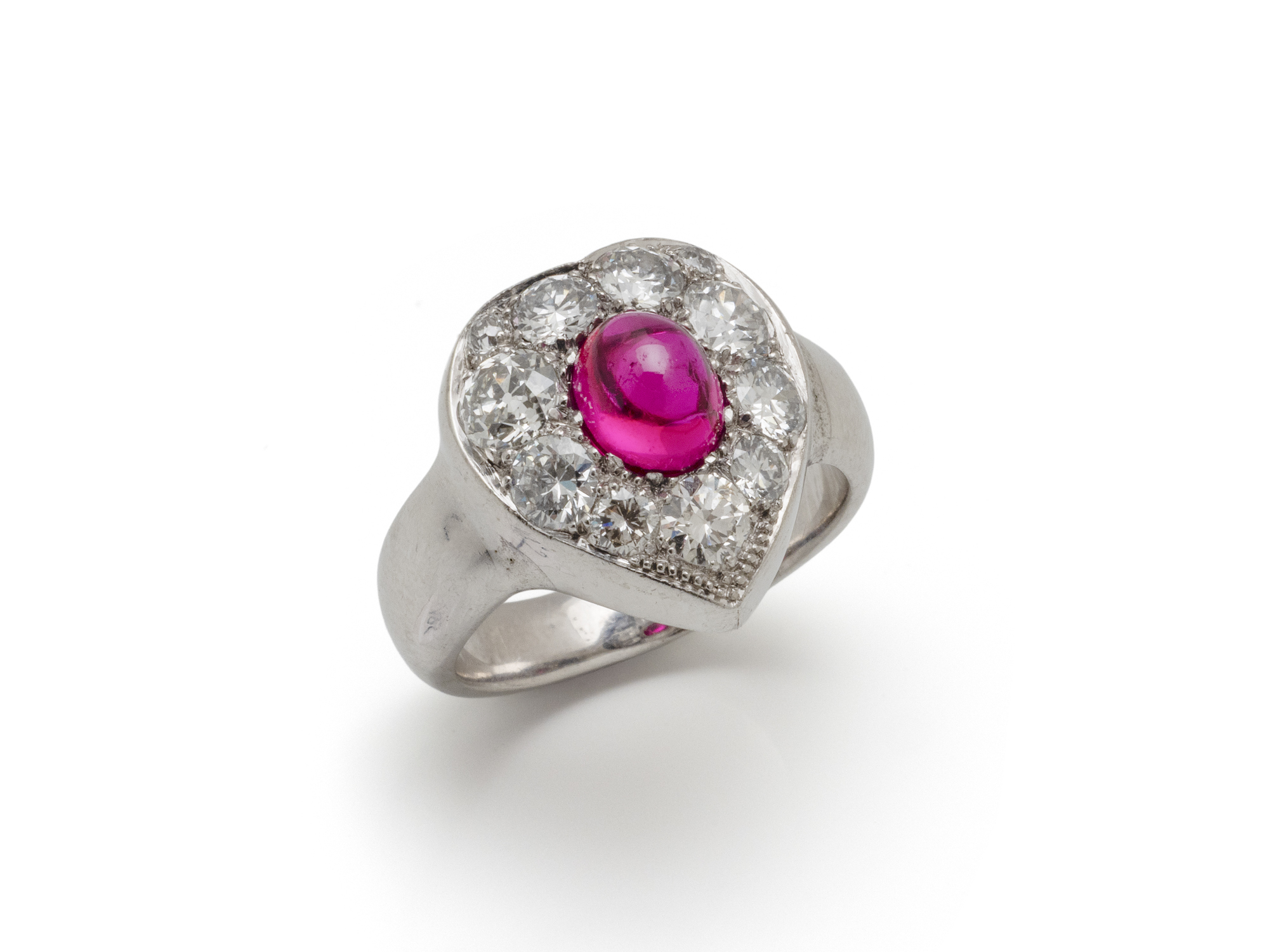 Lot n°78NV1094Bague en or gris 750 millièmes, ornée d'un rubis taille coussin rectangle en serti double griffe, épaulé de diamants taille baguette en légère chute. Travail français.