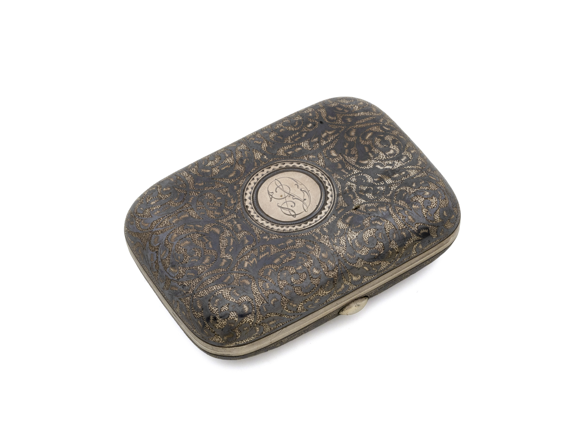 Lot n°267NV1098Boîte en argent 800 millièmes titré 84 zolotnik de forme rectangulaire à bords arrondis, à décor niellé sur les deux faces de motifs d'entrelacs de feuillage et centré sur la face principale du monogramme gravé CV dans un médaillon circulaire. Moscou, avant 1899.