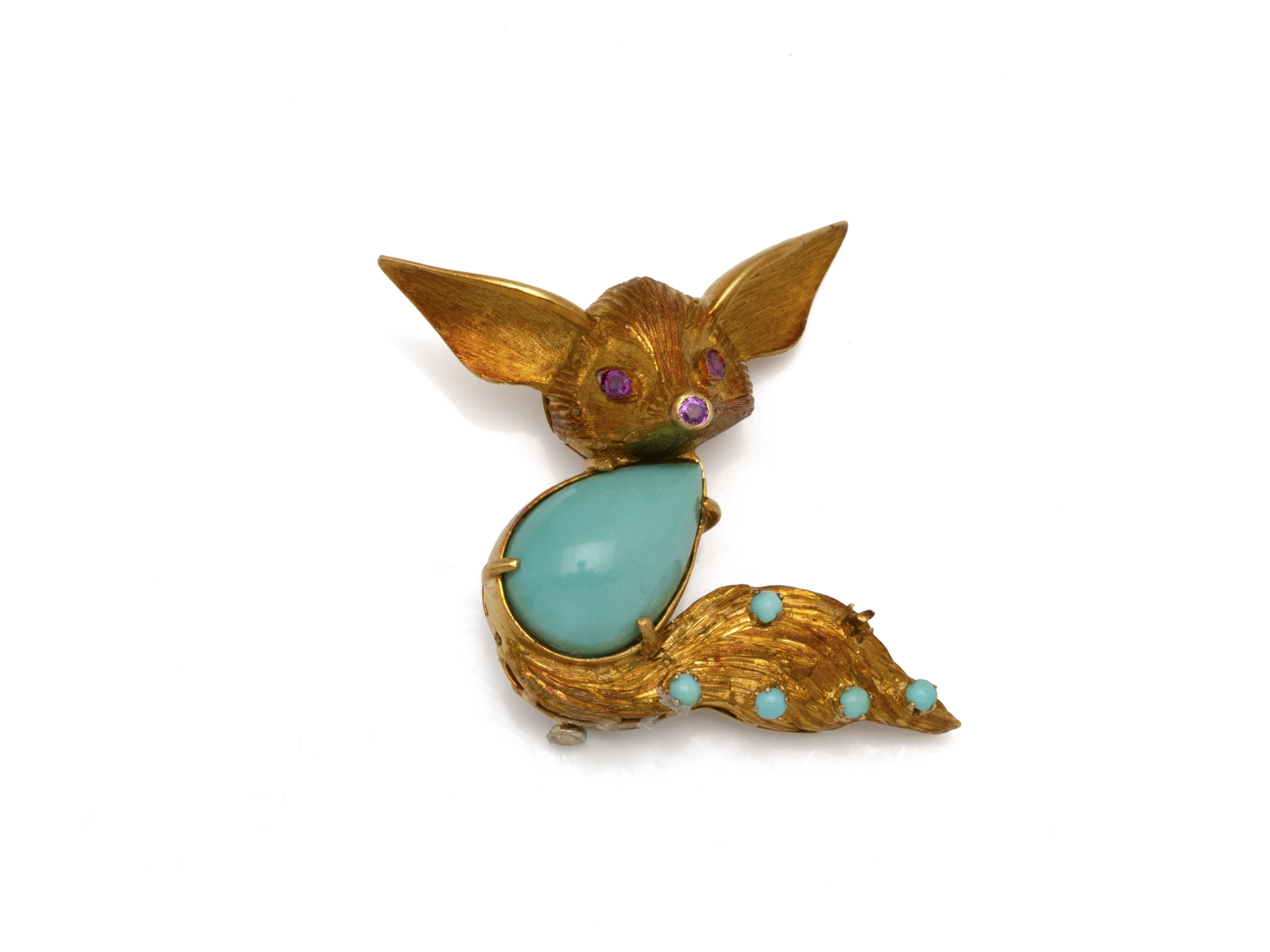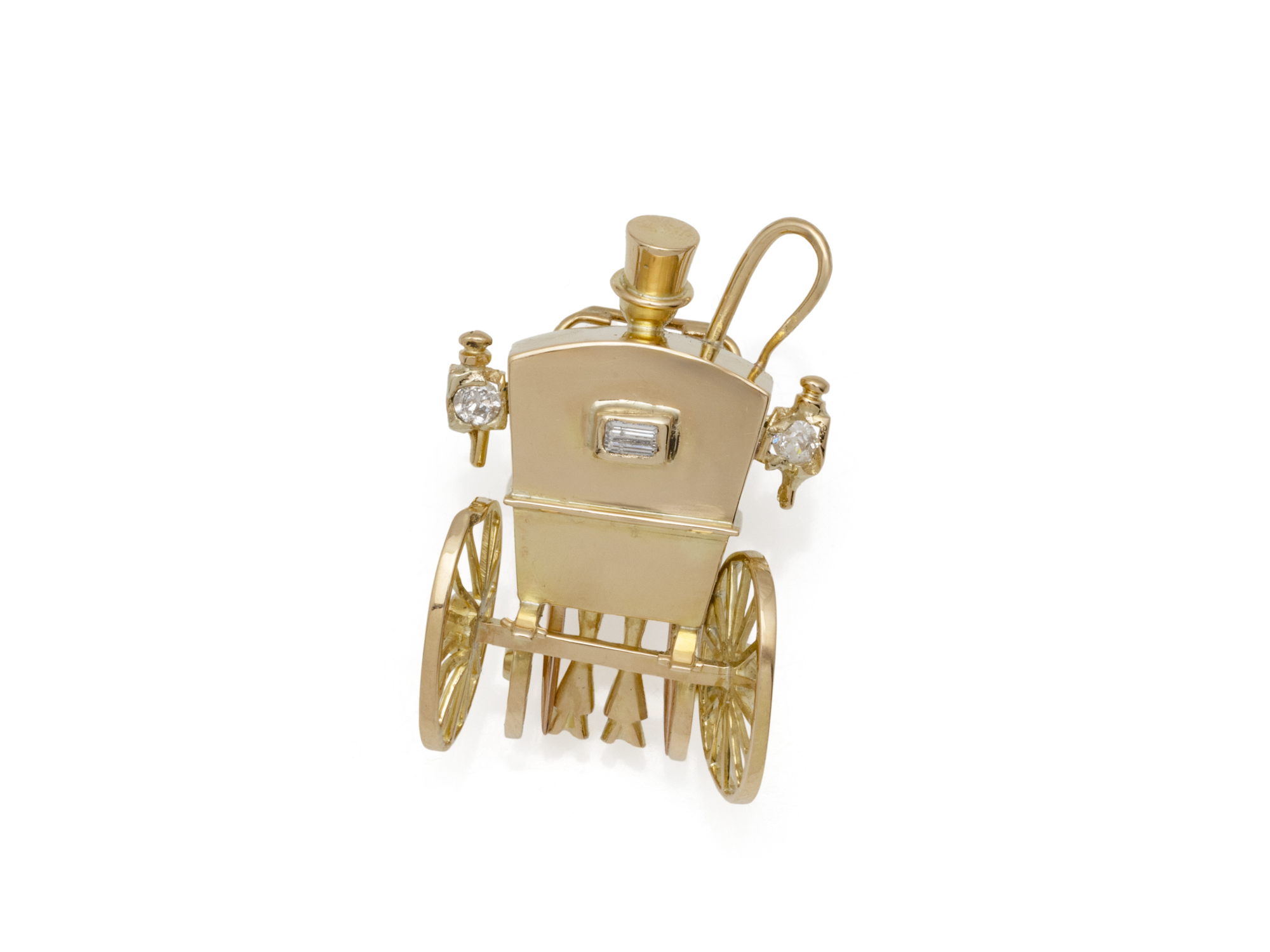 Lot n°79NV1102Broche clip de revers en or 750 millièmes, stylisant une calèche et son cocher en vue de derrière, la fenêtre et les lanternes rehaussées de diamants brillantés et taille baguette. Travail probablement espagnol. (petites déformations)