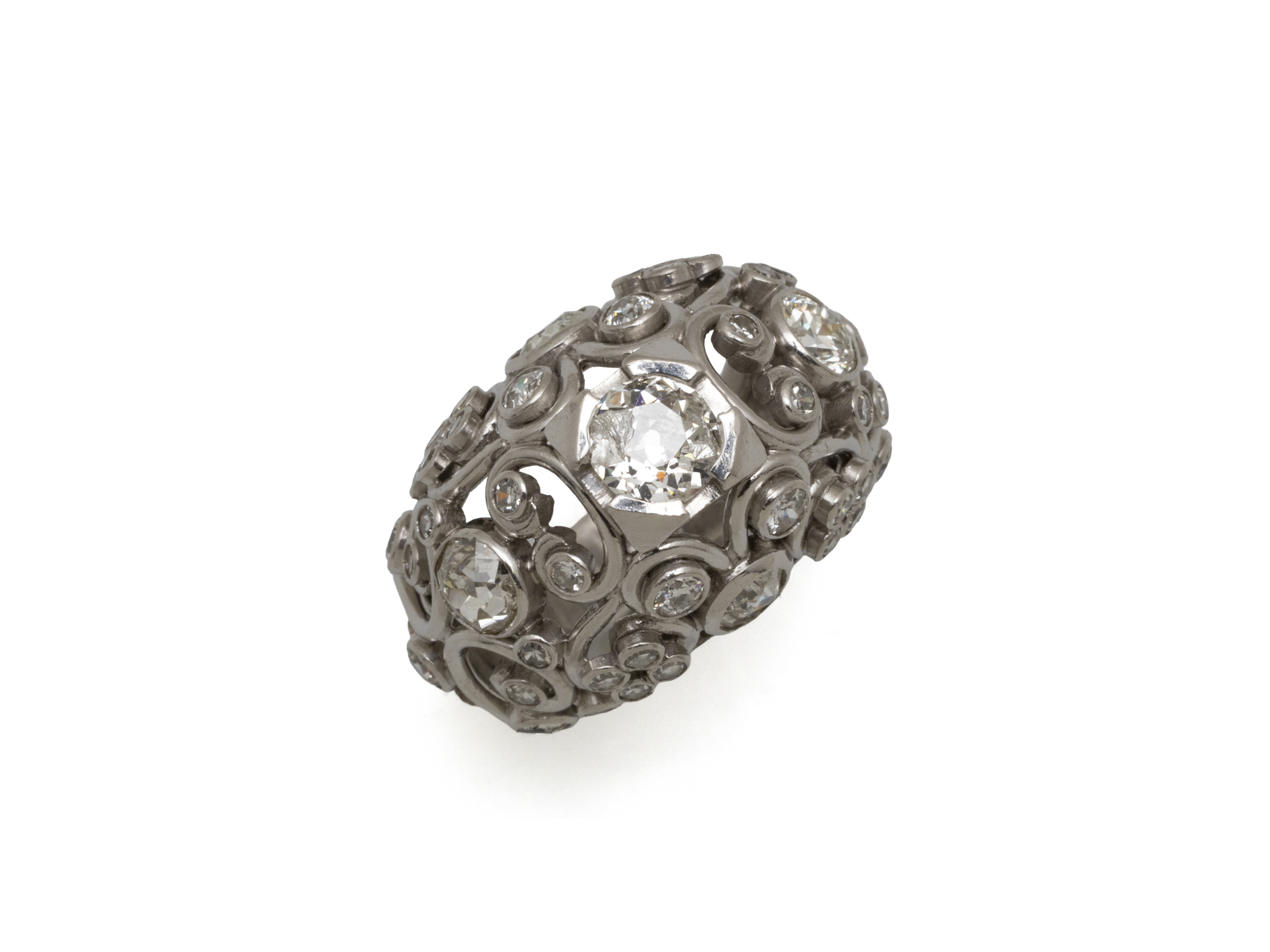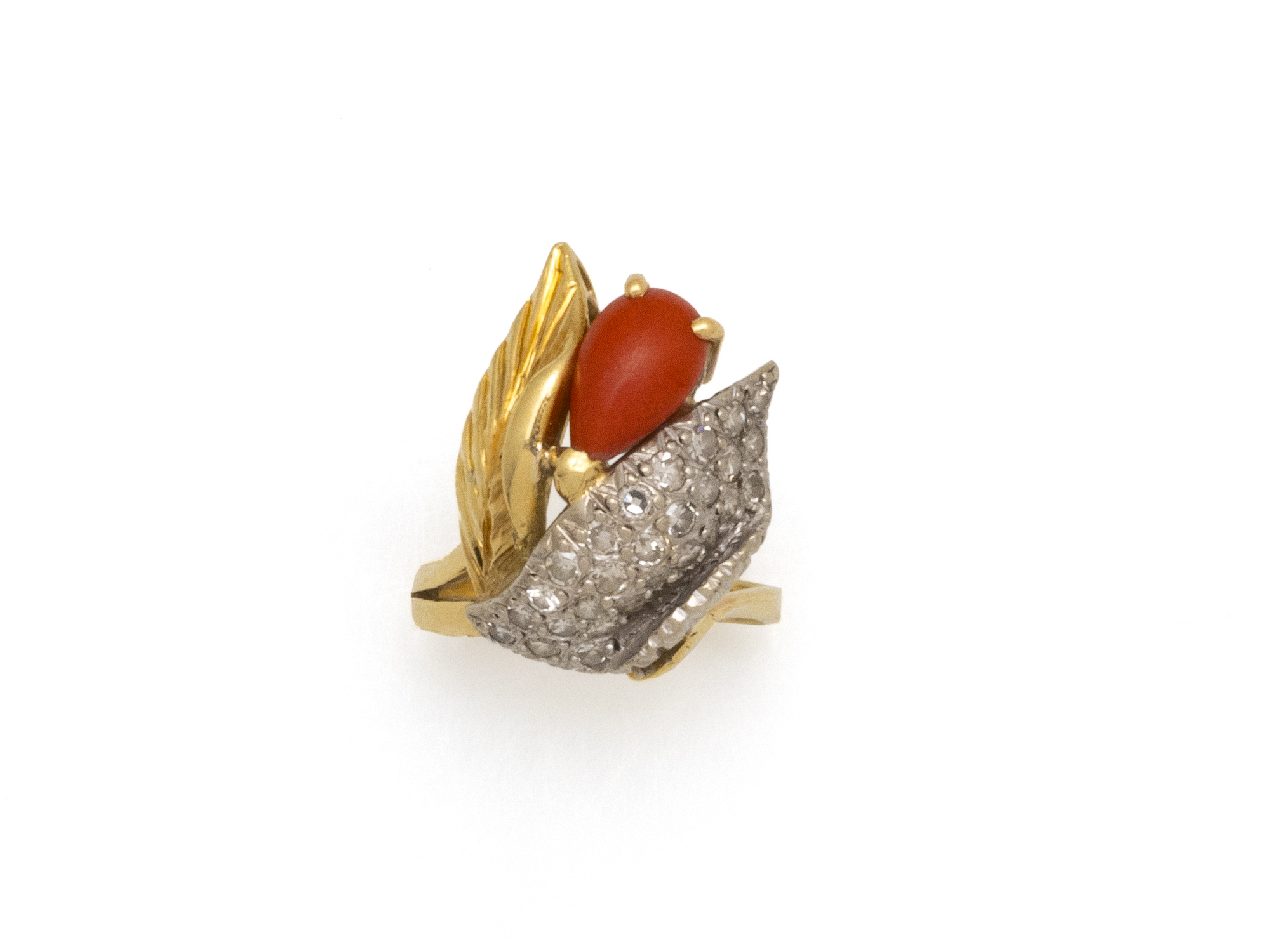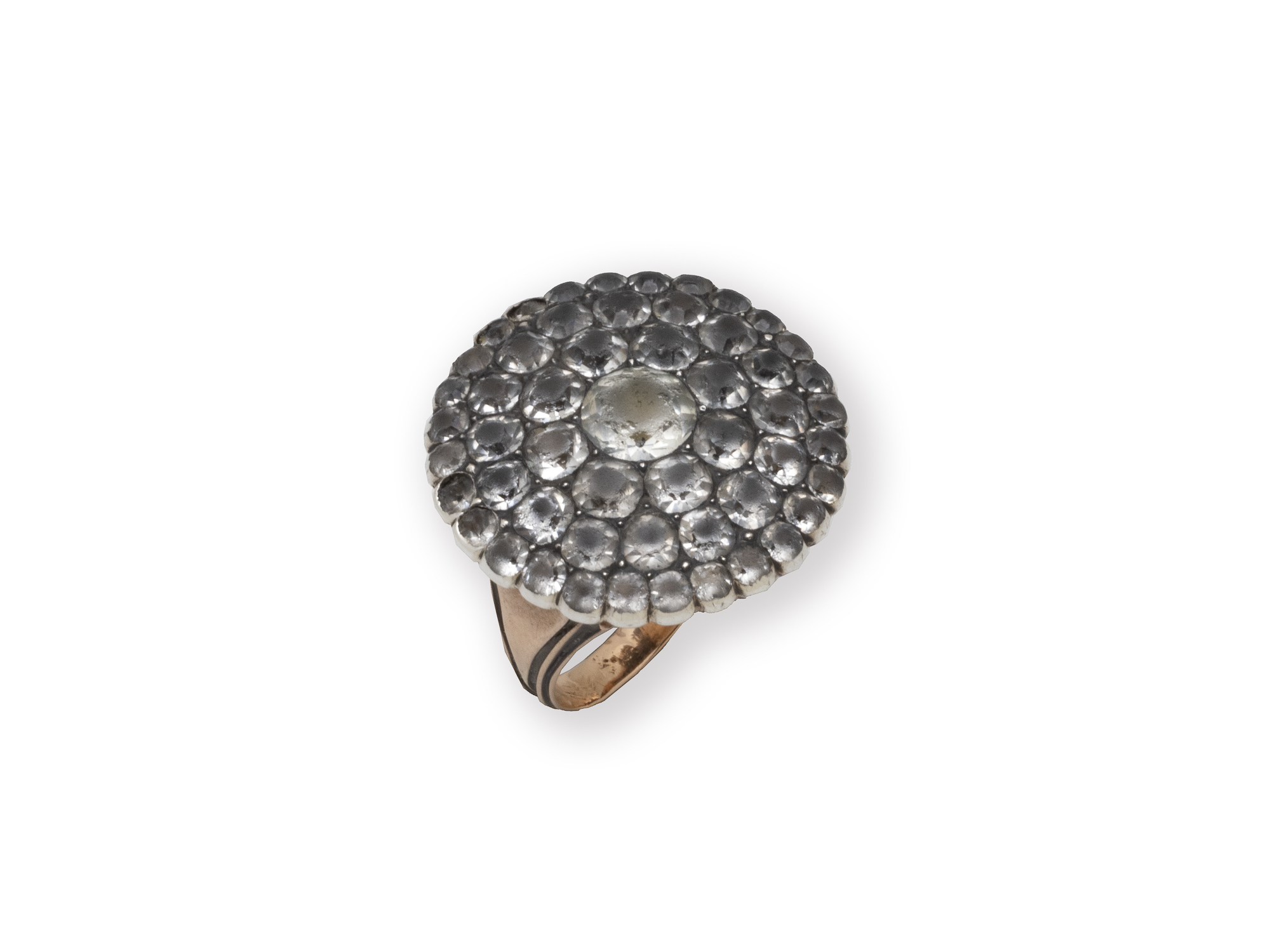 Lot n°37NV1107Belle bague en or rose 750 et argent 800 millièmes habillée de pierres du Rhin, la monture finement ciselée à décor floral. Travail probablement de la fin du XVIII° début XIX°siècle.