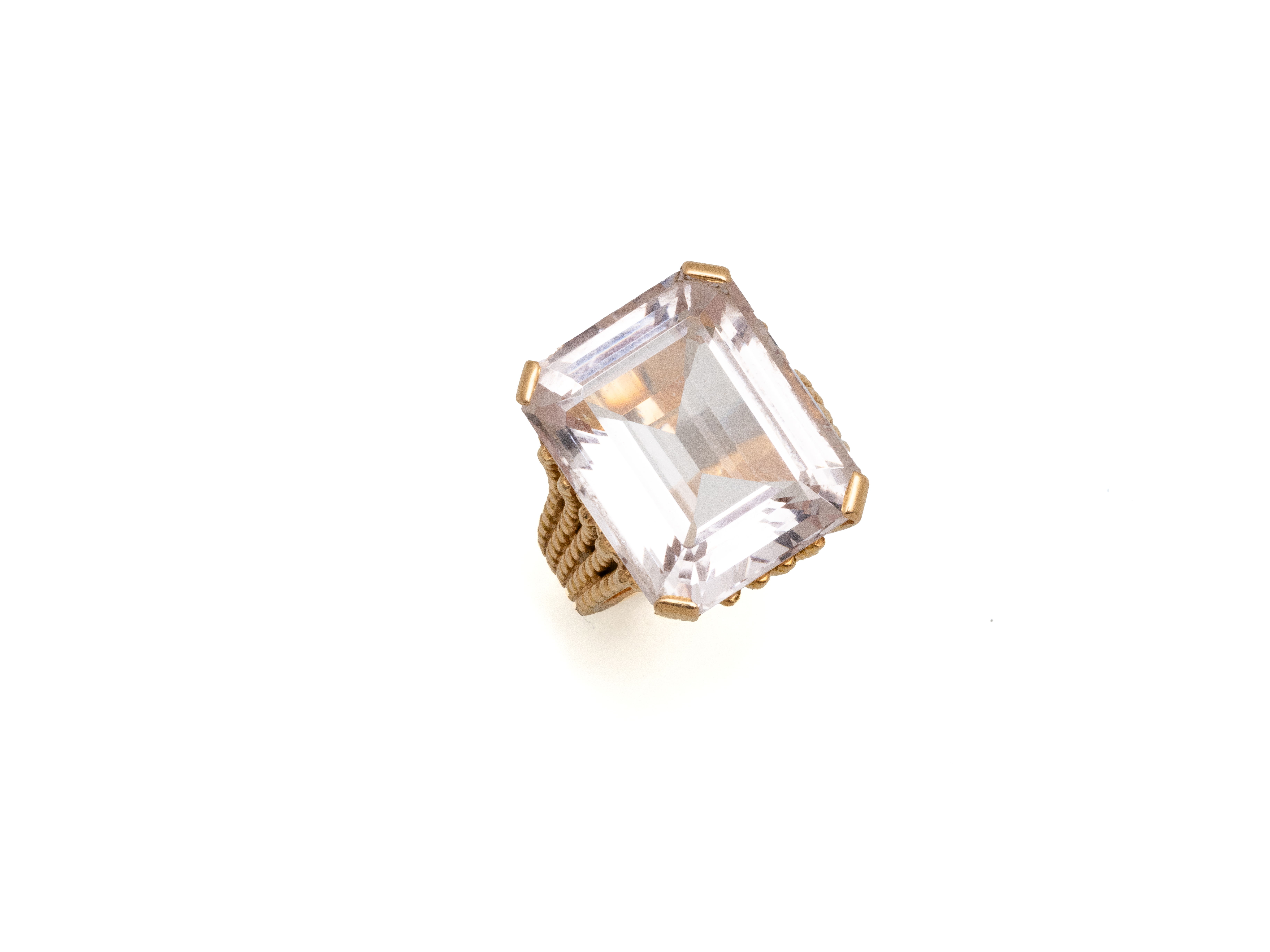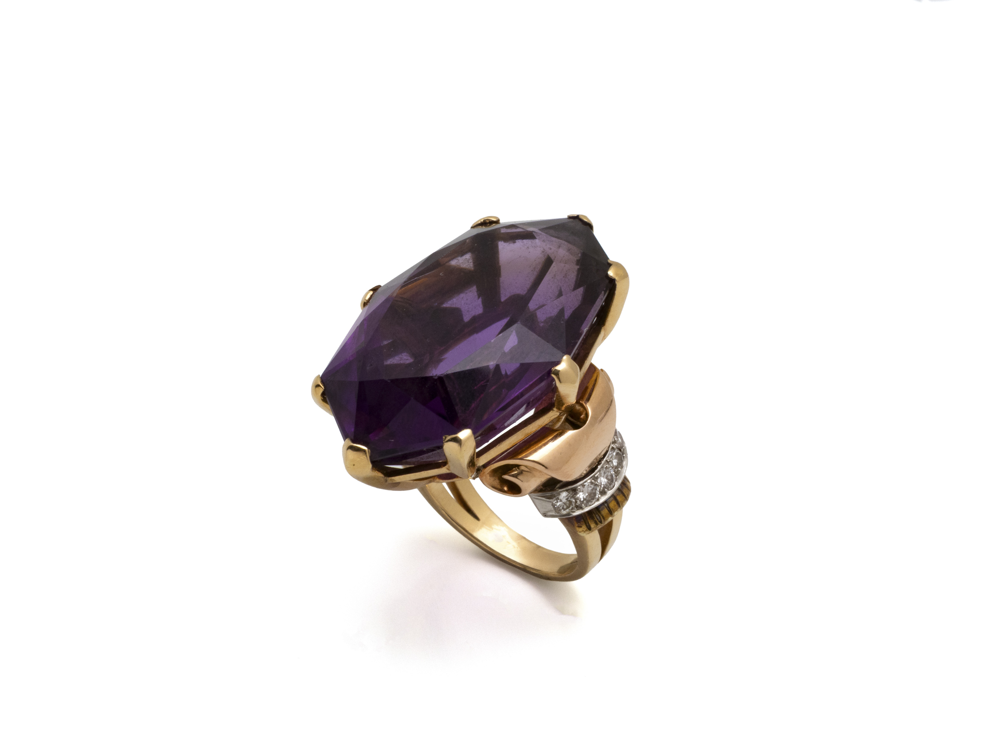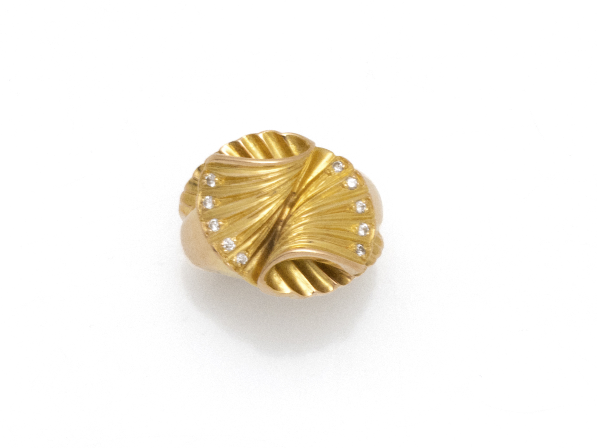 Lot n°37NV1107Belle bague en or rose 750 et argent 800 millièmes habillée de pierres du Rhin, la monture finement ciselée à décor floral. Travail probablement de la fin du XVIII° début XIX°siècle.