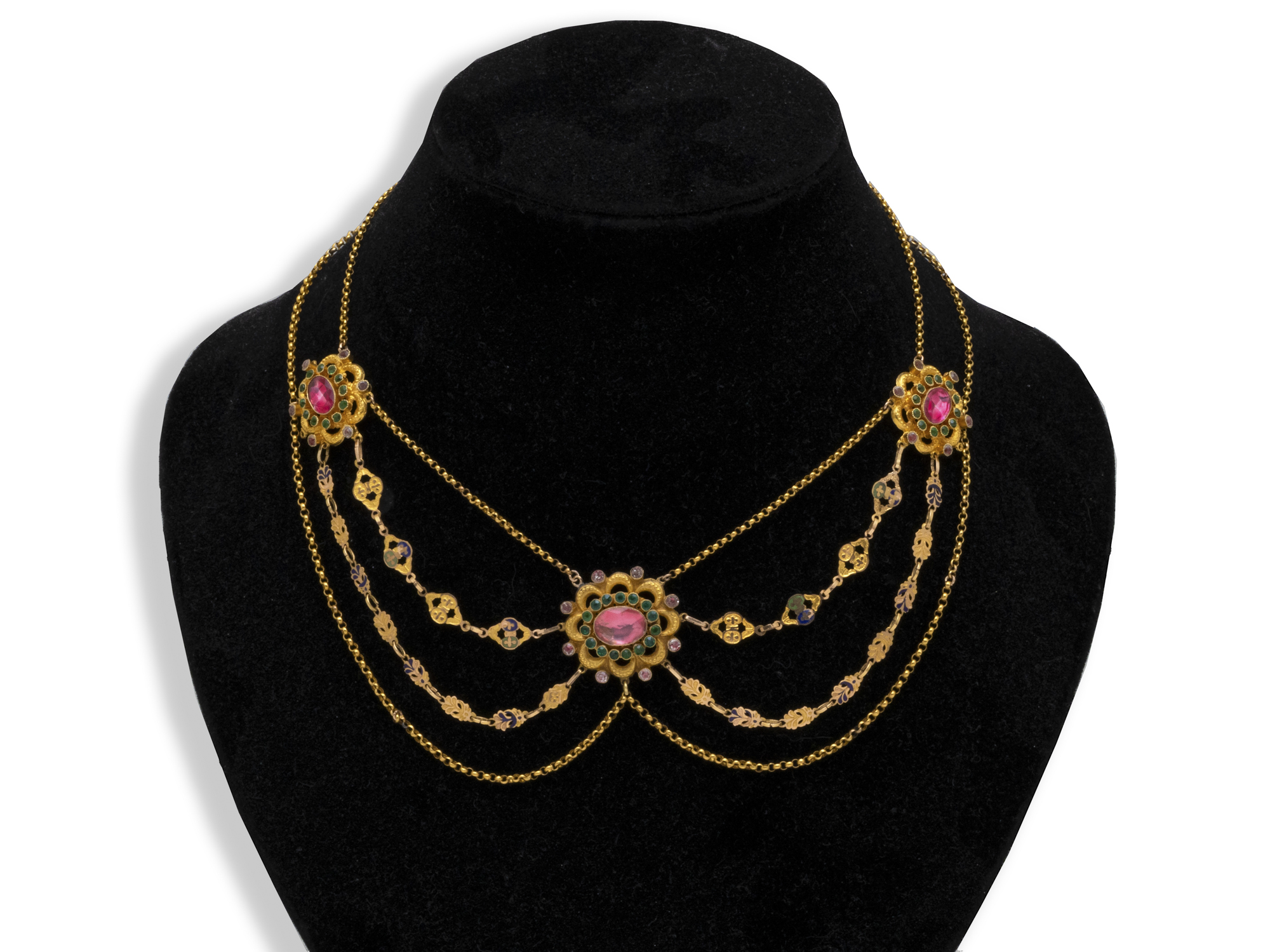 Lot n°33NV1114Délicat collier dit ''d'esclavage'' en or 750 millièmes, composé de 3 médaillons ovales estampés décorés de pierres de couleur roses et vertes sur clinquant. Il est agrémenté d'un fermoir bâtonnet. Travail français de la seconde moitié du XIX°siècle.