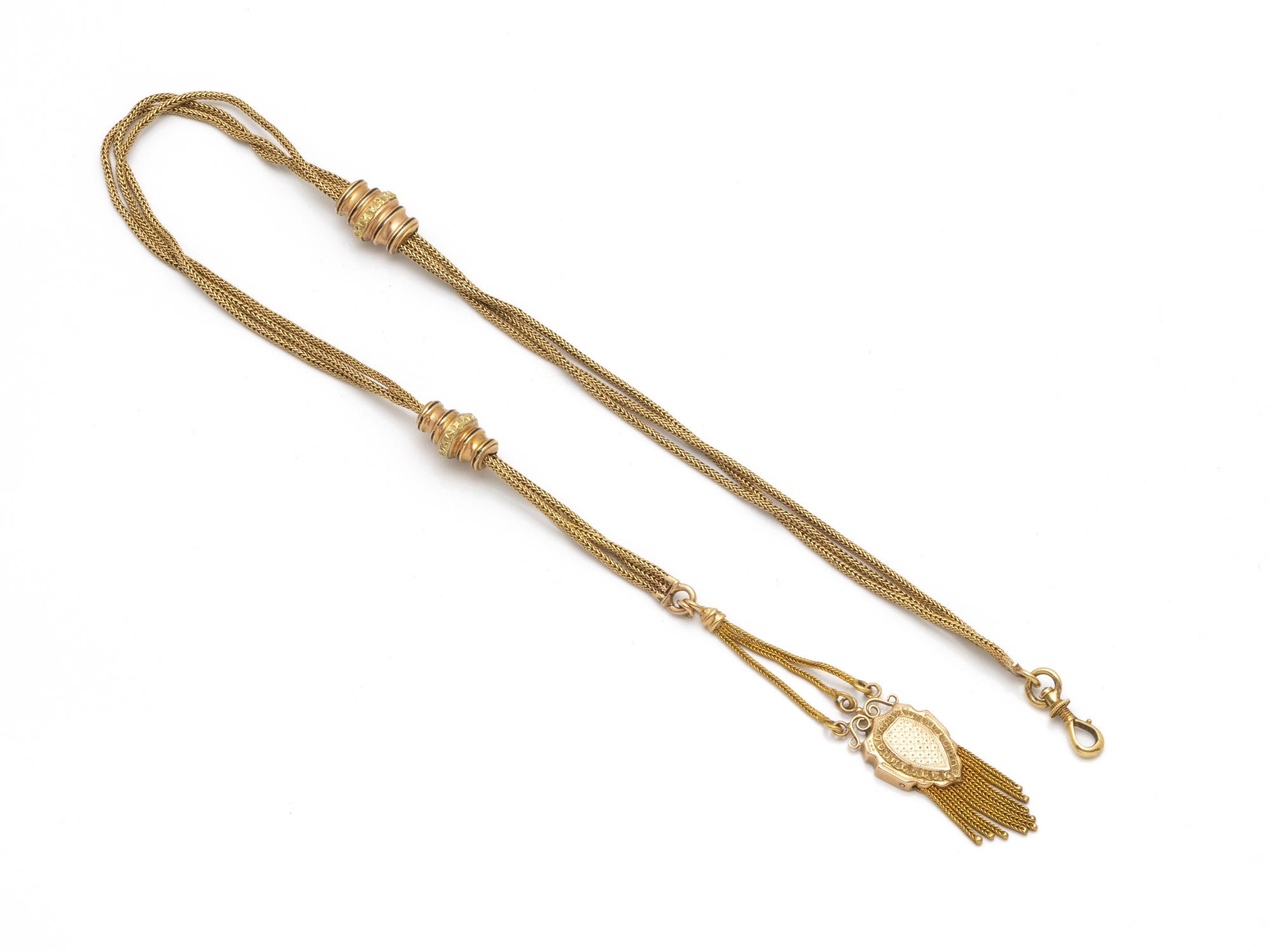 Lot n°39NV1134Chaîne de montre en or 750 millièmes à 3 brins maille colonne, ornée de 2 coulants émaillés. Elle est agrémentée d'un pendentif habillé d'une frange et d'un