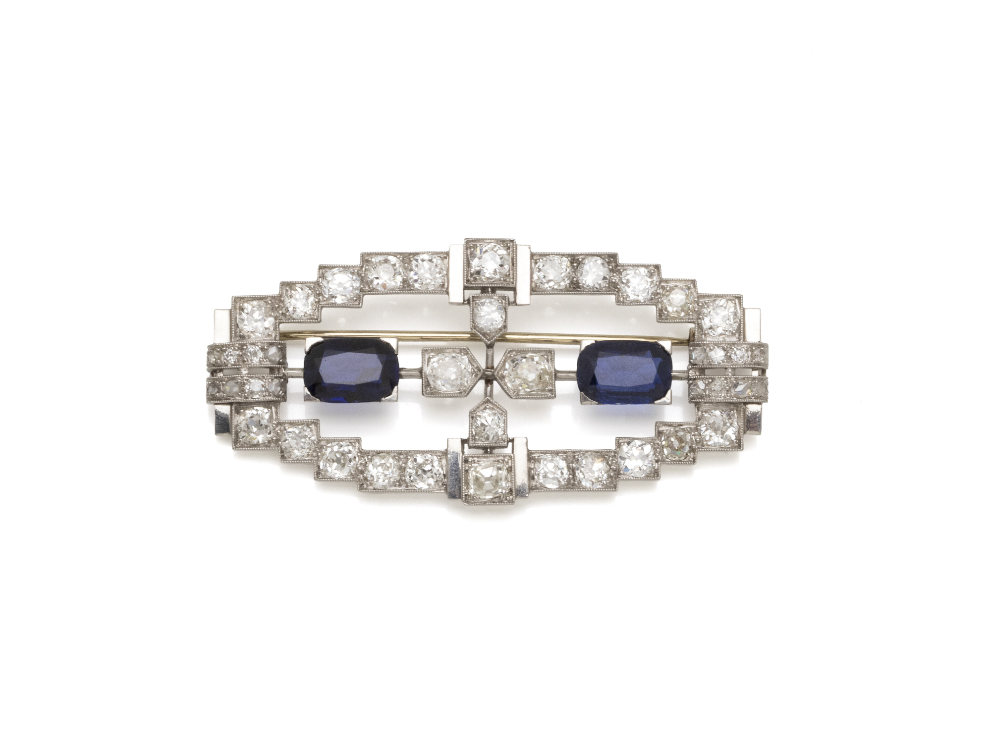 Lot n°75NV1140Broche plaque en platine 850 millièmes, à décor géométrique ajouré, ornée de 2 saphirs taille coussin rectangle en serti griffe, rehaussée de diamants taille ancienne et de quelques roses diamantées. Épingle en or gris 750 millièmes. Vers 1930.