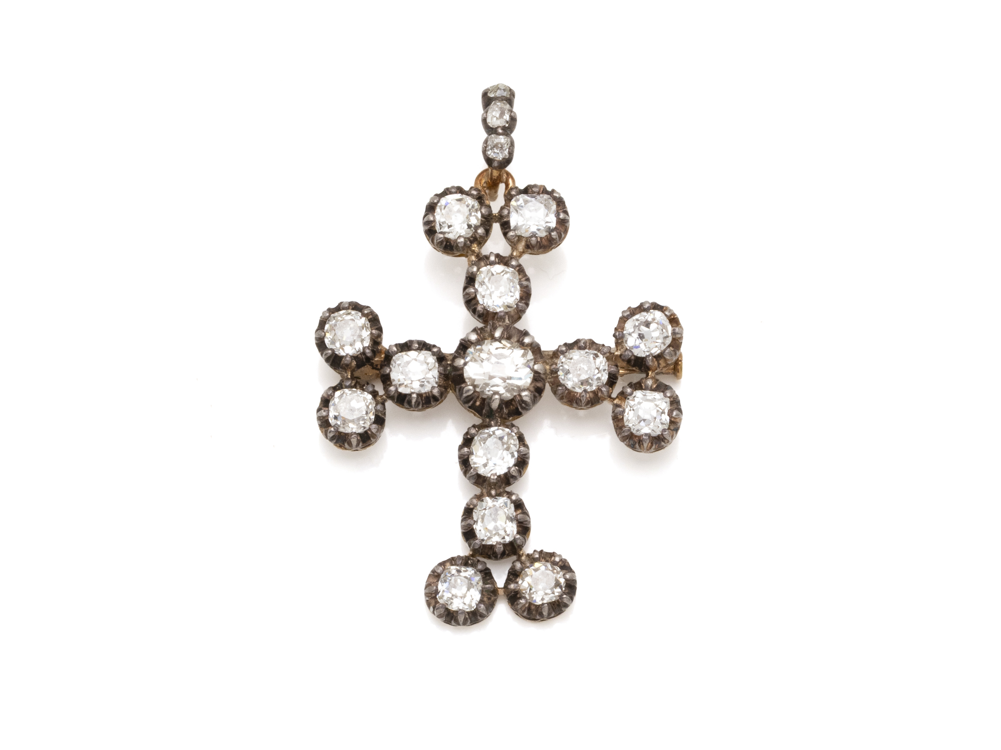 Lot n°38NV1141Pendentif en or 750 et argent 800 millièmes, retenant une croix habillée de diamants taille ancienne en serti griffe. Bélière diamantée. Travail du milieu du XIX° siècle.