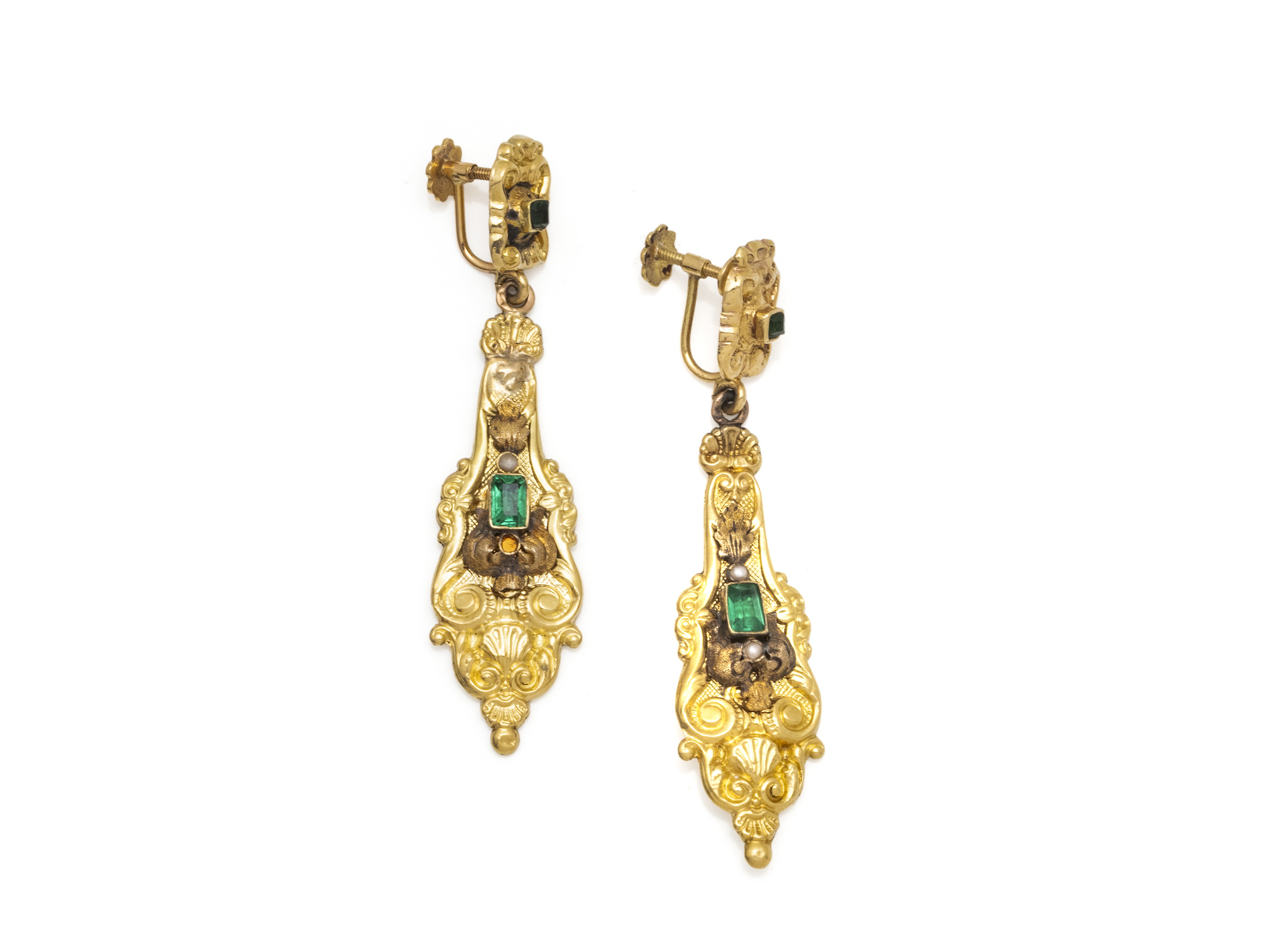 Lot n°32NV1155Paire de pendants d'oreilles en or 750 millièmes estampé décorés de coquilles ponctuées de pierres vertes imitant l'émeraude et de petites demi-perles. Travail français d'époque Charles X. (petites usures et manque)