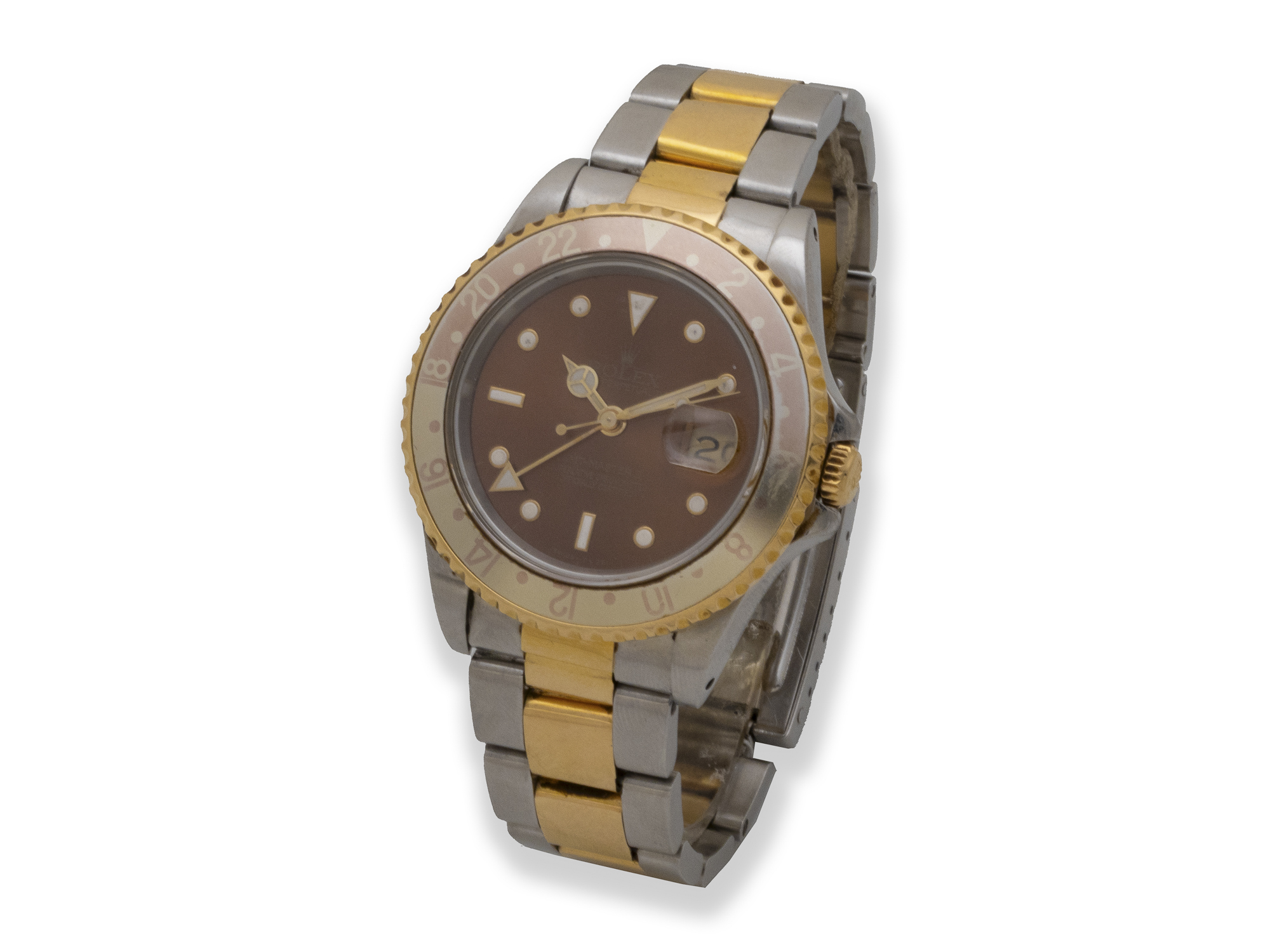 Montre bracelet d'homme en or 750 millièmes et acier, cadran marron rayonnant avec index appliqués, aiguille flèche pour le second fuseau horaire, affichage de la date par guichet à 3 heures avec loupe, lunette graduée en or émaillée. Mouvement automatique signé, numéroté 5218408. Bracelet en or 750 millièmes et acier, maillons oyster avec boucle déployante réglable en acier, signée. (rayures, petite déformation sur un maillon, usure au bracelet)