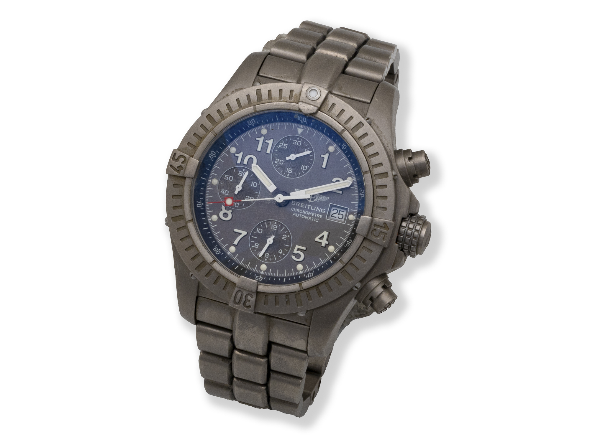 Montre chronographe en titane, cadran gris anthracite 3 compteurs, avec chiffres arabes appliqués et index luminescents, affichage de la date par guichet à 3 heures, lunette tournante graduée. Mouvement automatique. Bracelet en titane, maillons articulés avec et boucle déployante en titane, signée. (rayures)