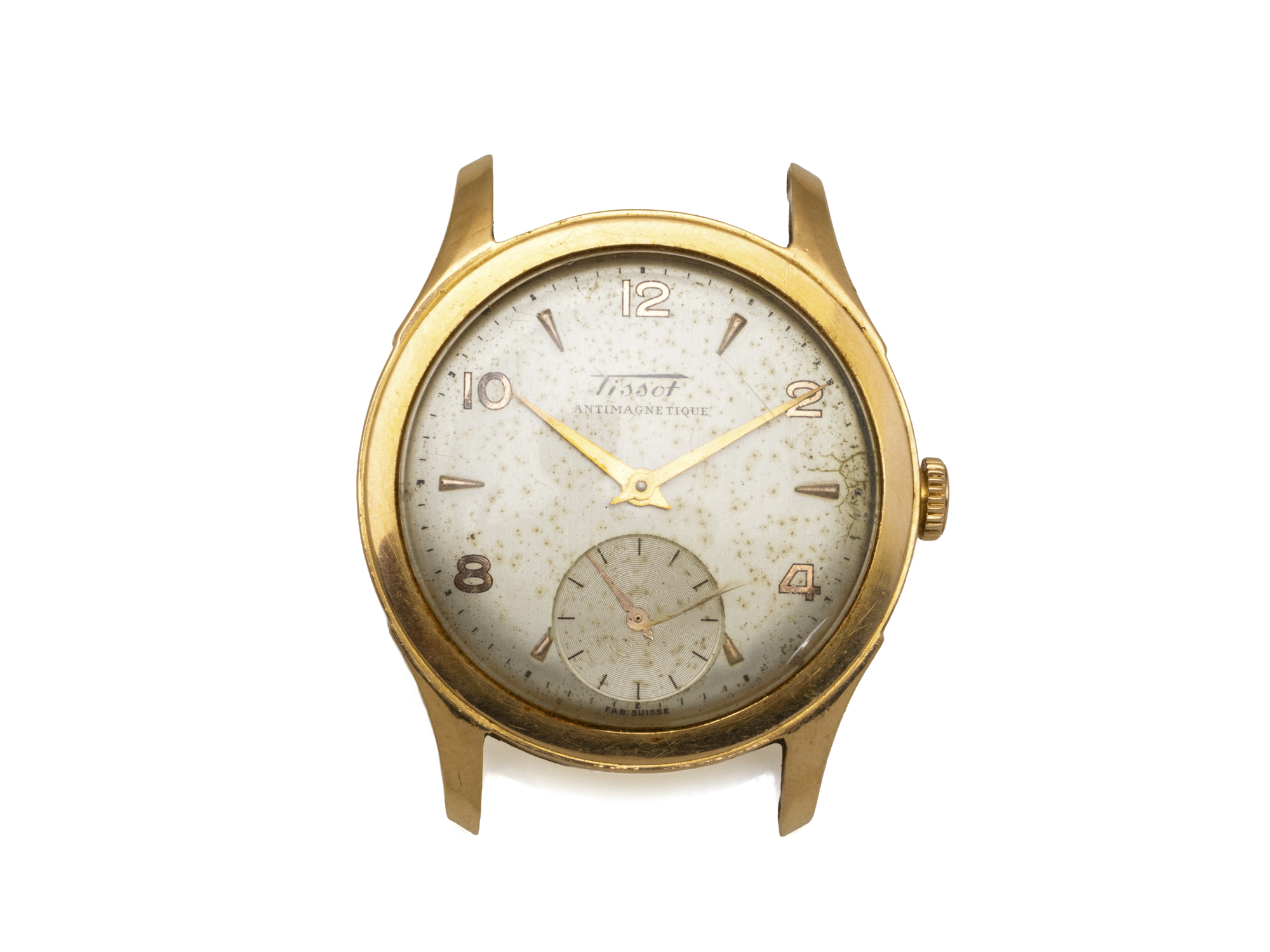 Montre bracelet d'homme en or 750 millièmes, .boîtier de forme ronde, cadran ivoire taché avec chiffres arabes peints et index flèches appliqués, petite trotteuse à 6 heures. Mouvement mécanique, remontage manuel, signé, numéroté 2449899. Manque le bracelet. Vers 1950. (rayures, petits chocs au verre)