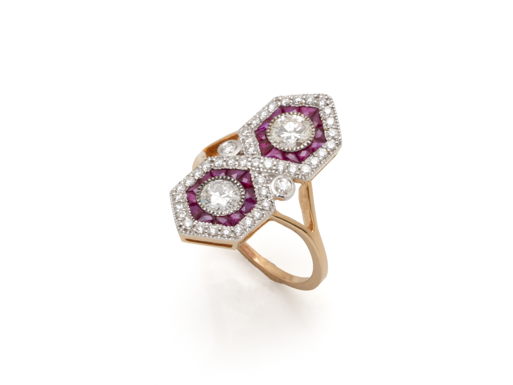 Lot n°51NV1065Bague toi et moi en or rose 750 et platine 850 millièmes, ornée d'un diamant taille ancienne et d'un grenat rond facetté en serti griffe, épaulés de petits diamants taille ancienne. Travail français de la fin du XIX° siècle.